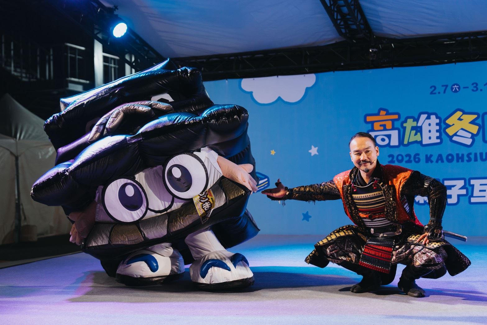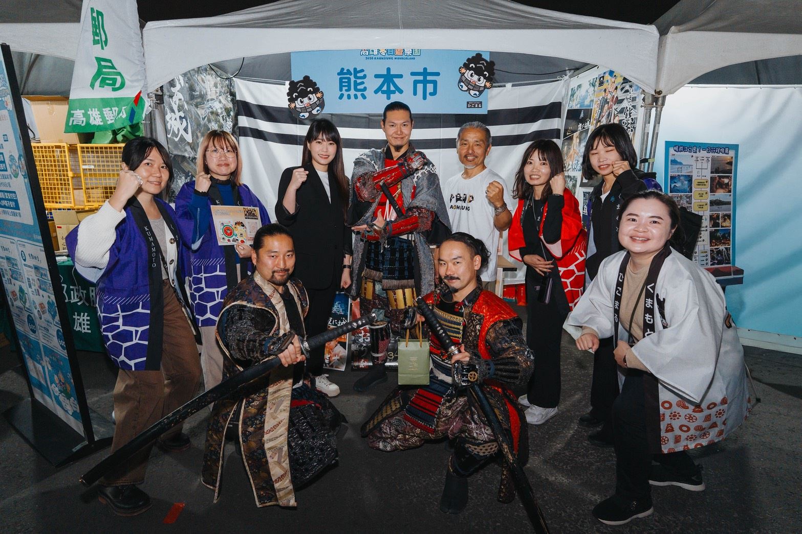 高雄燈會冬日遊樂園於7日熱鬧登場,高雄的日本友好城市團隊也接力來台演出助陣,為活動注入濃厚多元國際氛圍。日本熊本市深受歡迎的「熊本城迎賓武將隊」於2月7日至8日再度受邀來到高雄,由加藤清正、細川忠興、島津義弘等武將角色,攜手熊本市吉祥物「肥後丸」帶來精彩互動演出,感染力十足的舞台魅力與熱鬧氣氛,吸引眾多市民與遊客駐足欣賞,隊員更大秀苦練的中文,大喊:「馬到成功、馬上發財!」提前祝賀農曆新年獲得滿堂喝彩!此次來訪為熊本城迎賓武將隊第6次赴高雄演出,不僅展現熊本獨特的歷史文化魅力,也再次見證高雄與熊本多年來深厚的城市情誼。