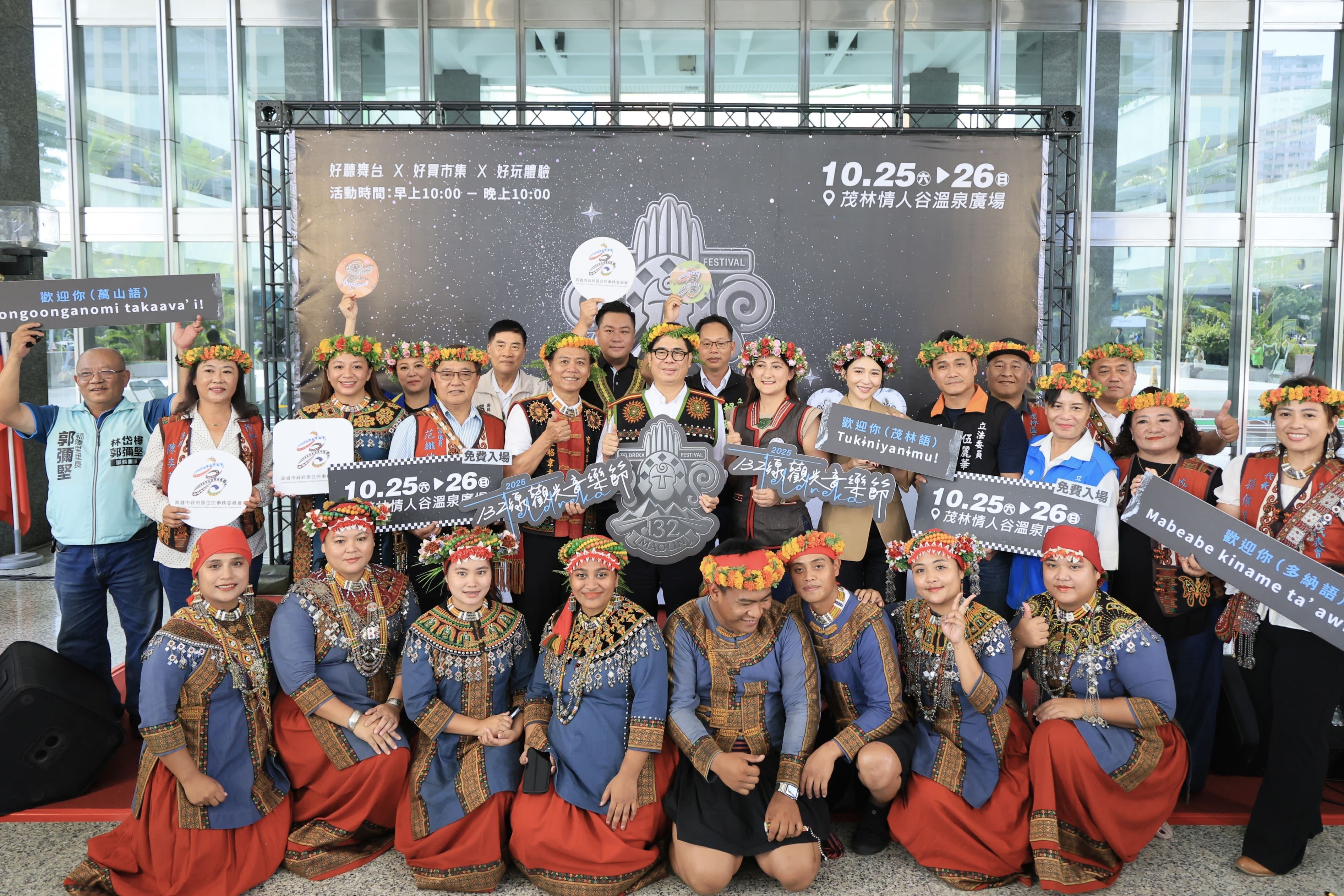 【高雄訊】「2025 Teldreka 132線觀光音樂節」將於10月25、26日在茂林區情人谷溫泉園區盛大登場。高雄市長陳其邁今(17)日出席於市府四維行政中心廣場舉辦的活動宣傳記者會,與市府原民會主委阿布斯、茂林區長駱韋志等貴賓共同為活動揭開序幕。