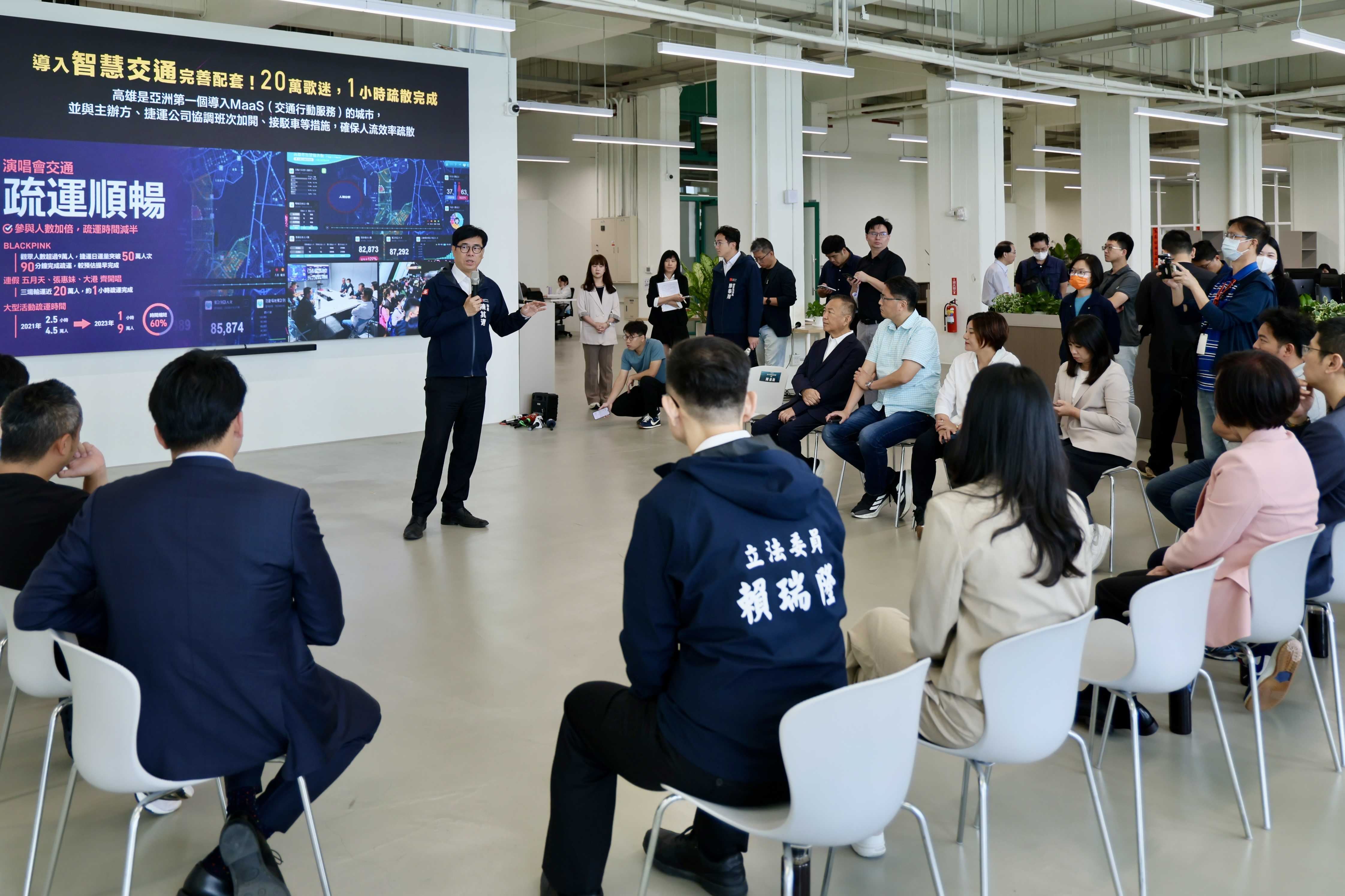 【高雄訊】為借鏡高雄經驗,台中市議會偕同立委何欣純南下參訪,請益數位轉型實務。高雄市長陳其邁今(2)日親自出席交流活動,並由經發局針對「智慧城市主權AI研發基地」進行專案簡報,期盼透過雙方互動,共享智慧治理成果。