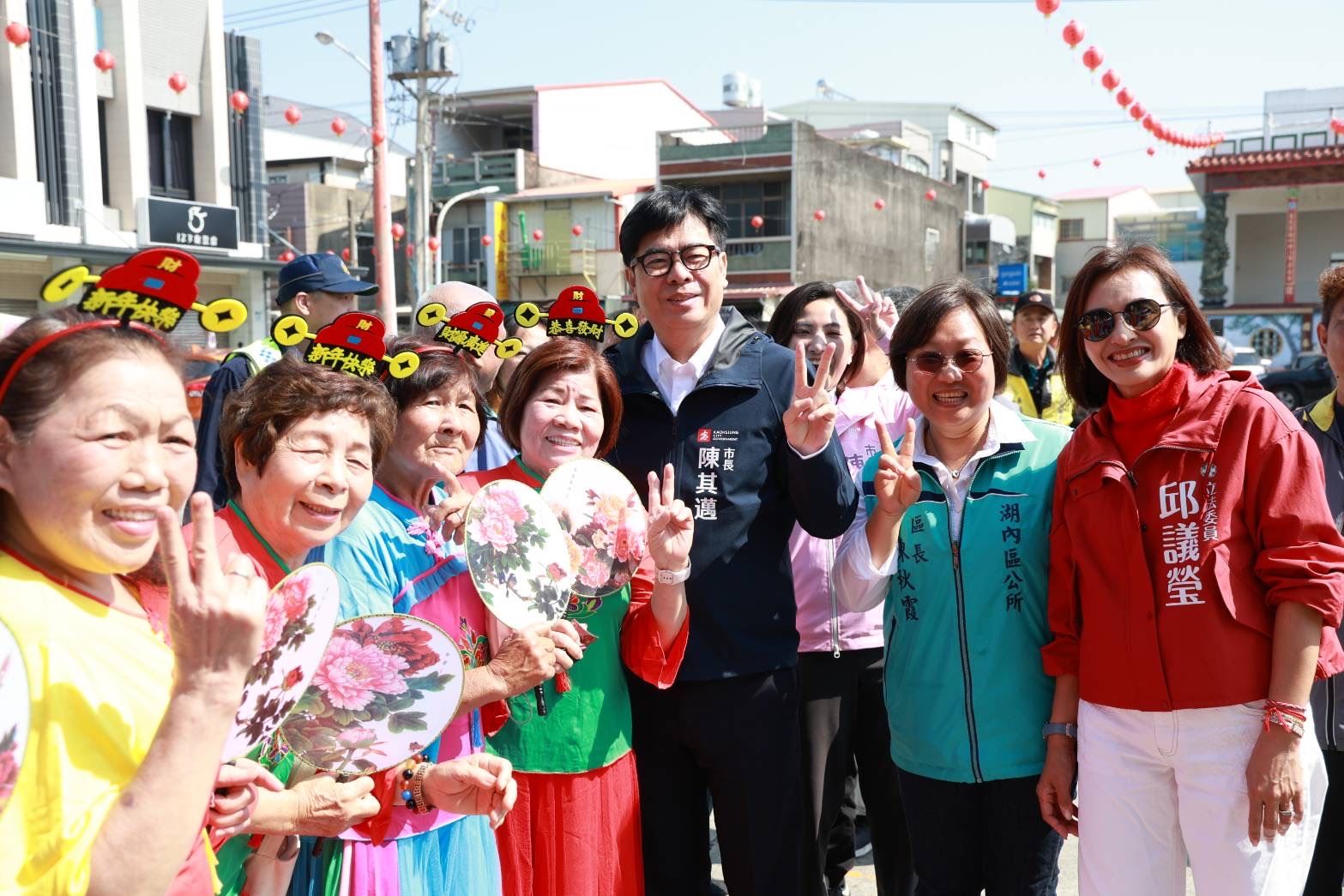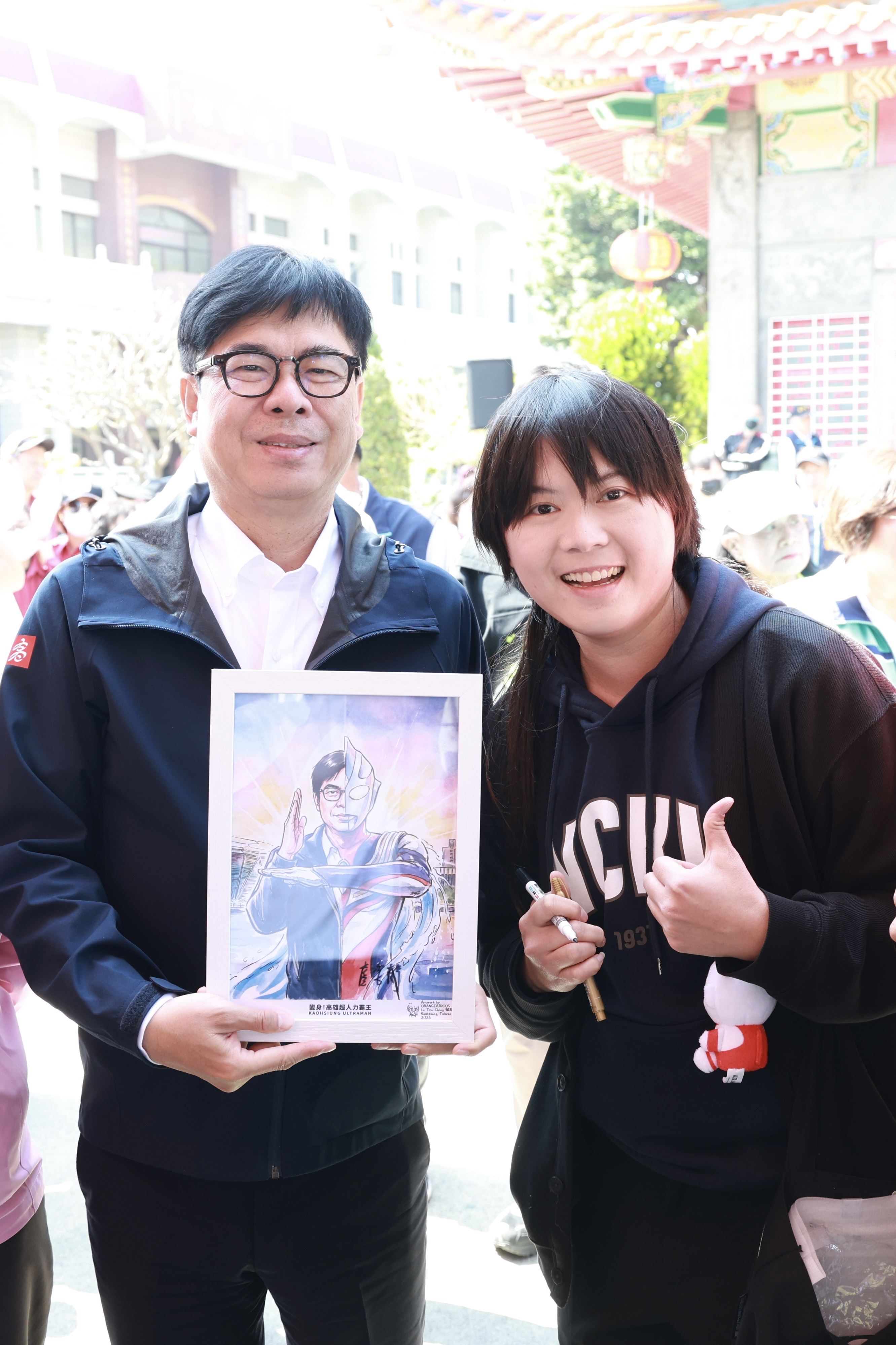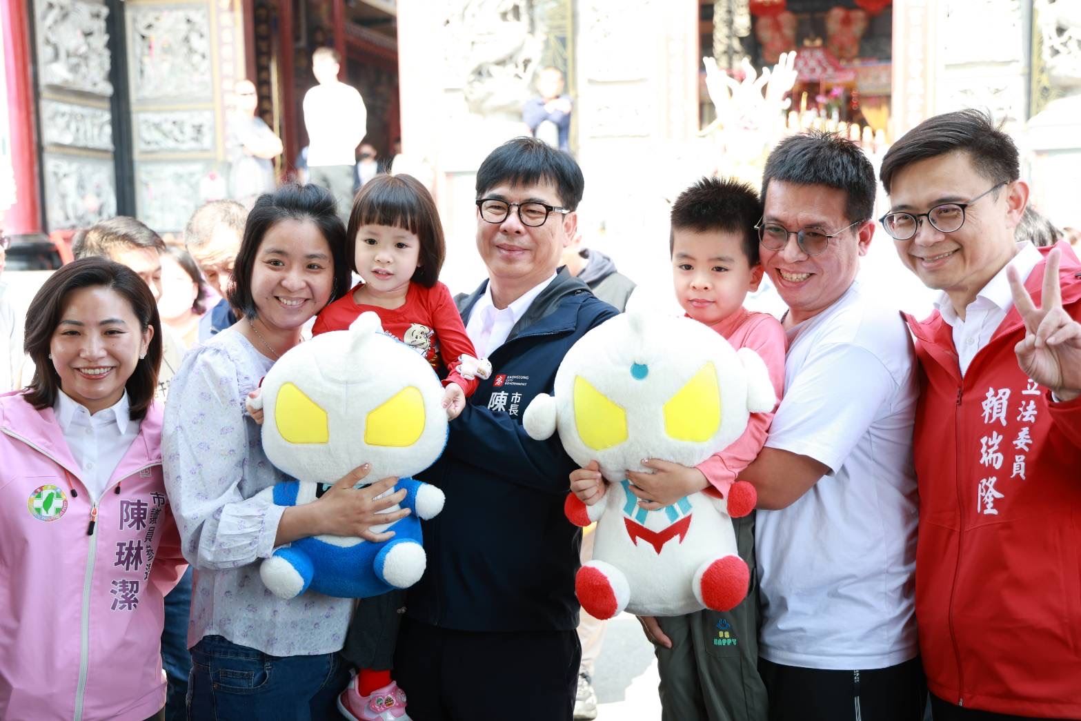 市長隨後轉往茄萣區萬福宮、湖內區慈濟宮及路竹區天后宮等地方信仰中心參香,現場民眾大排長龍。市長除親自發送超人力霸王開運小紅包,祝福市民朋友在新的一年「馬上有錢」、「馬上幸福」,也親切與盛裝出席、精心裝扮成超人力霸王或手持畫作的民眾互動合影、簽名留念,現場洋溢新年喜悅與熱鬧氣氛。
