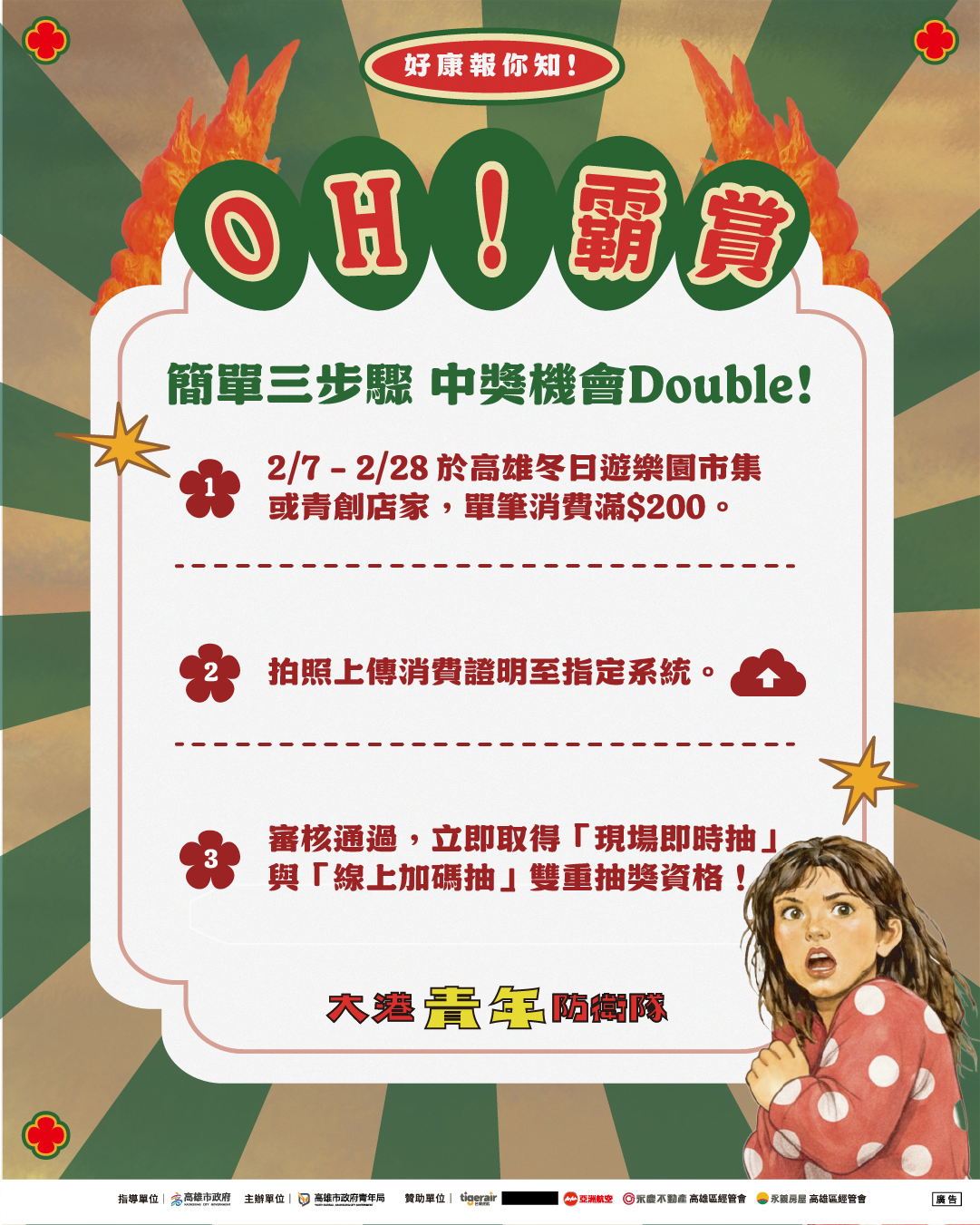 「OH!霸賞」抽獎採「現場即時抽」與「線上加碼抽」雙軌並行。即日起至2月28日止,凡於指定青創店家或冬日遊樂園周邊市集單筆消費滿200元,加入青年局官方LINE(@youth.kcg)完成登錄,即可取得雙重抽獎資格。