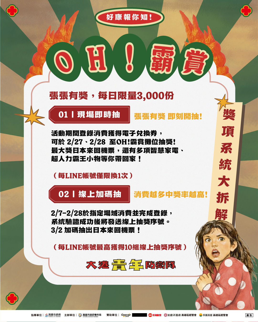 為極大化活動聲量,本次「OH!霸賞」攜手台灣虎航、樂桃航空及AirAsia亞洲航空,大方送出12套「高雄-日本」來回機票。台灣虎航提供高雄直飛沖繩、福岡、東京、札幌(新千歲)等熱門航點任選;樂桃航空提供每日高雄直飛大阪航線;AirAsia亞洲航空則帶來6月15日首航、每日高雄直飛大阪的新航線。此外,活動亦獲得永慶不動產、永義房屋支持,加碼20組熱門家電及超人力霸王限定週邊,總計多達6,000份獎項。