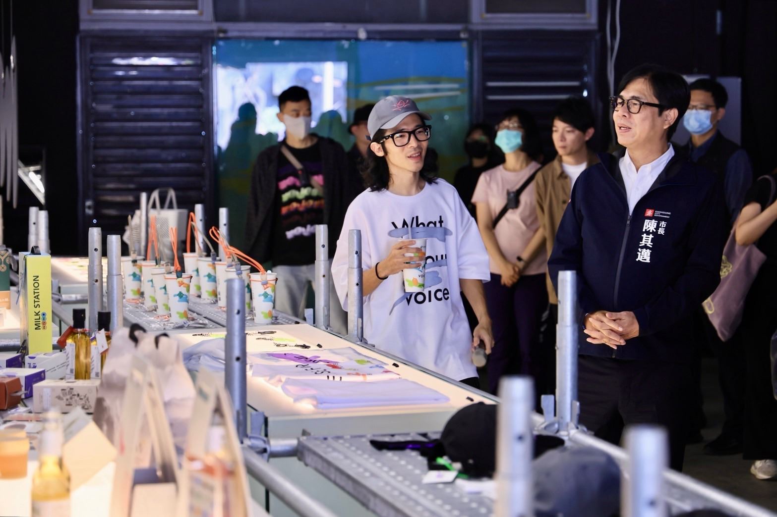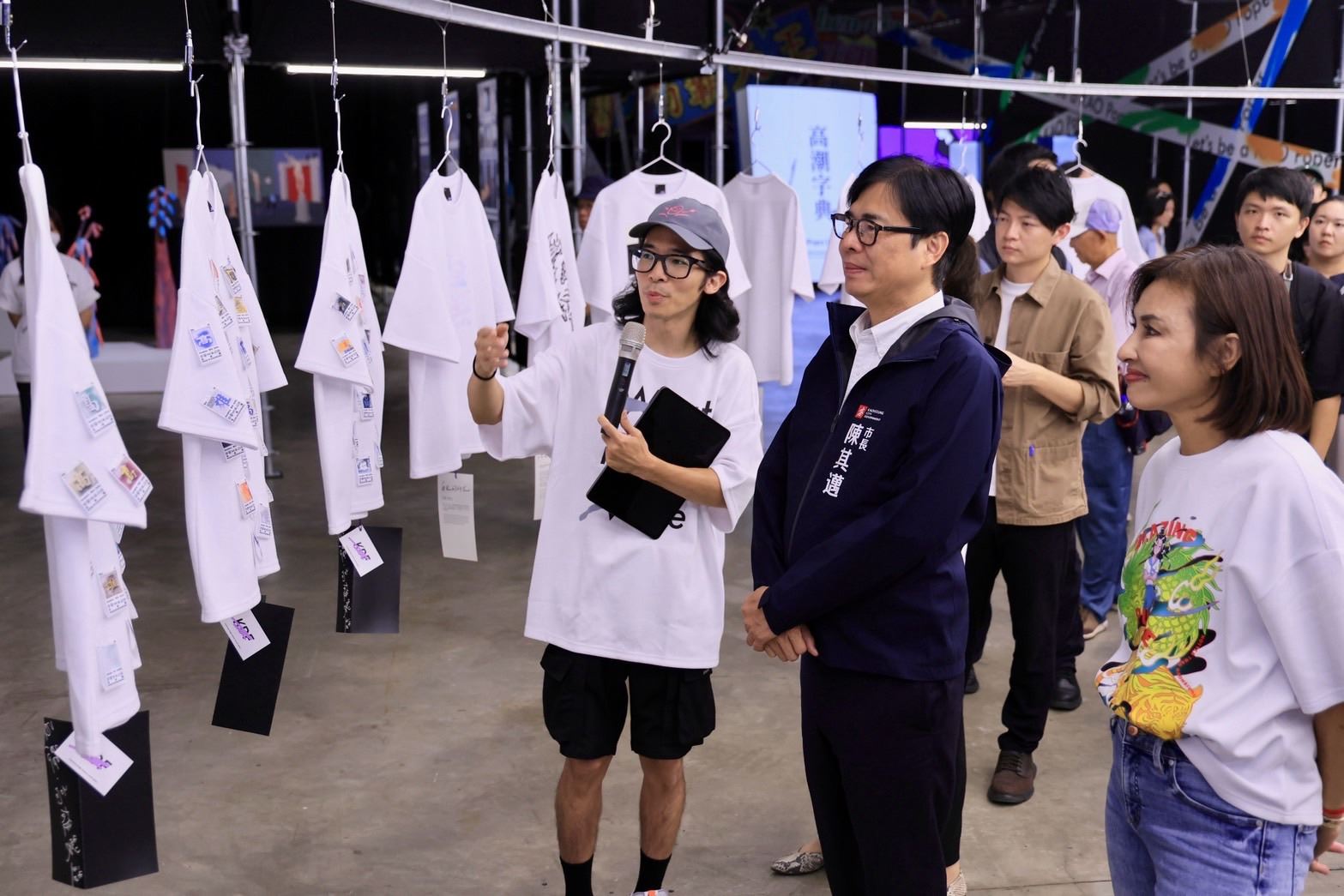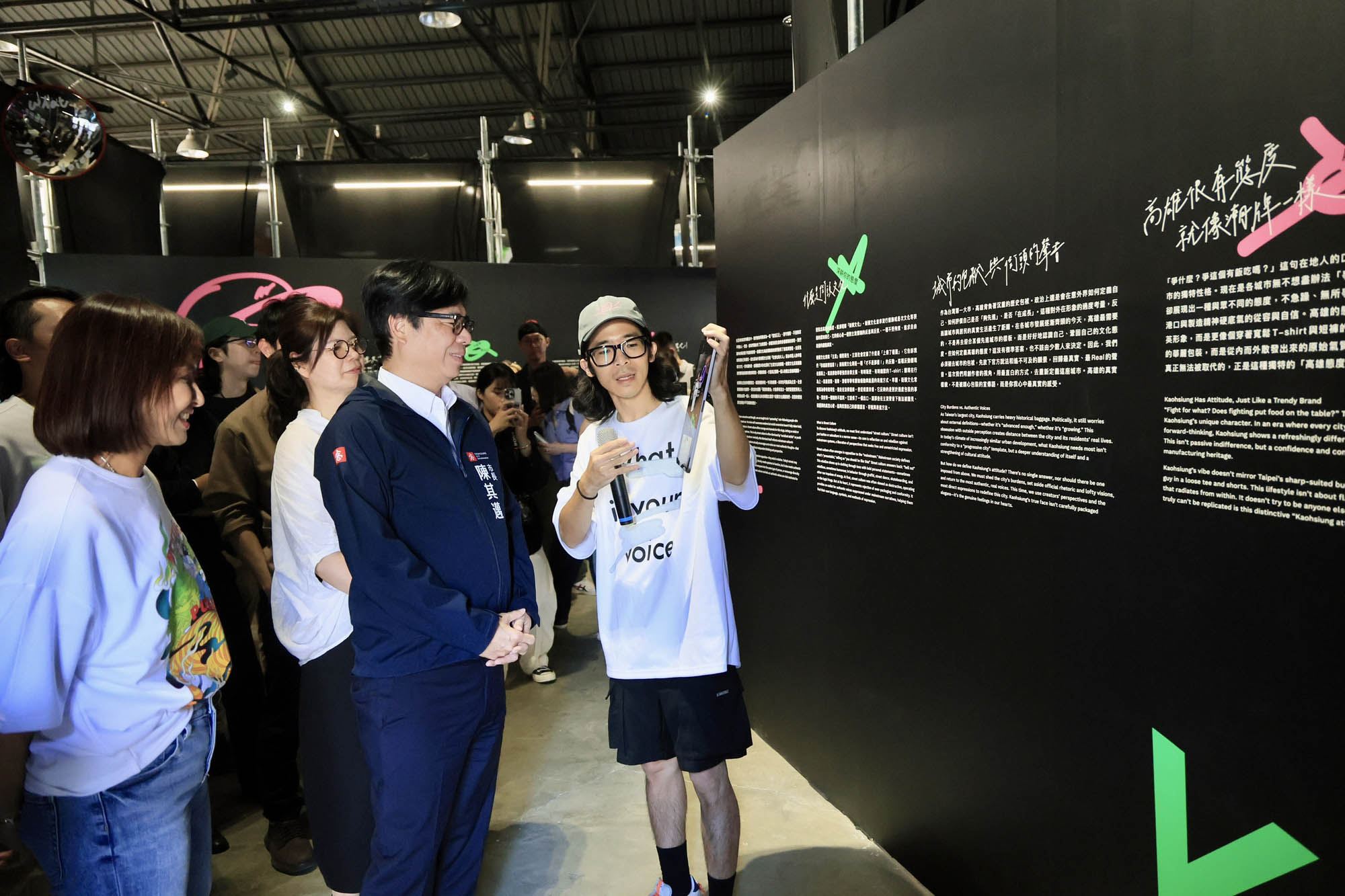 陳其邁出席開幕式欣賞「高雄態度秀」,也與林唯哲策展人現場合作繪製一件生猛有力、清涼有勁的高雄專屬潮T,並在獨一無二的手繪創意潮T上簽名,活靈活現的龍形圖樣搭配清涼手搖飲料,傳達陳其邁對高雄的城市想像;他隨後一一走訪參觀各創作展覽、體驗互動式展區,藉由設計與藝術的轉化,以多元的視角認識高雄。