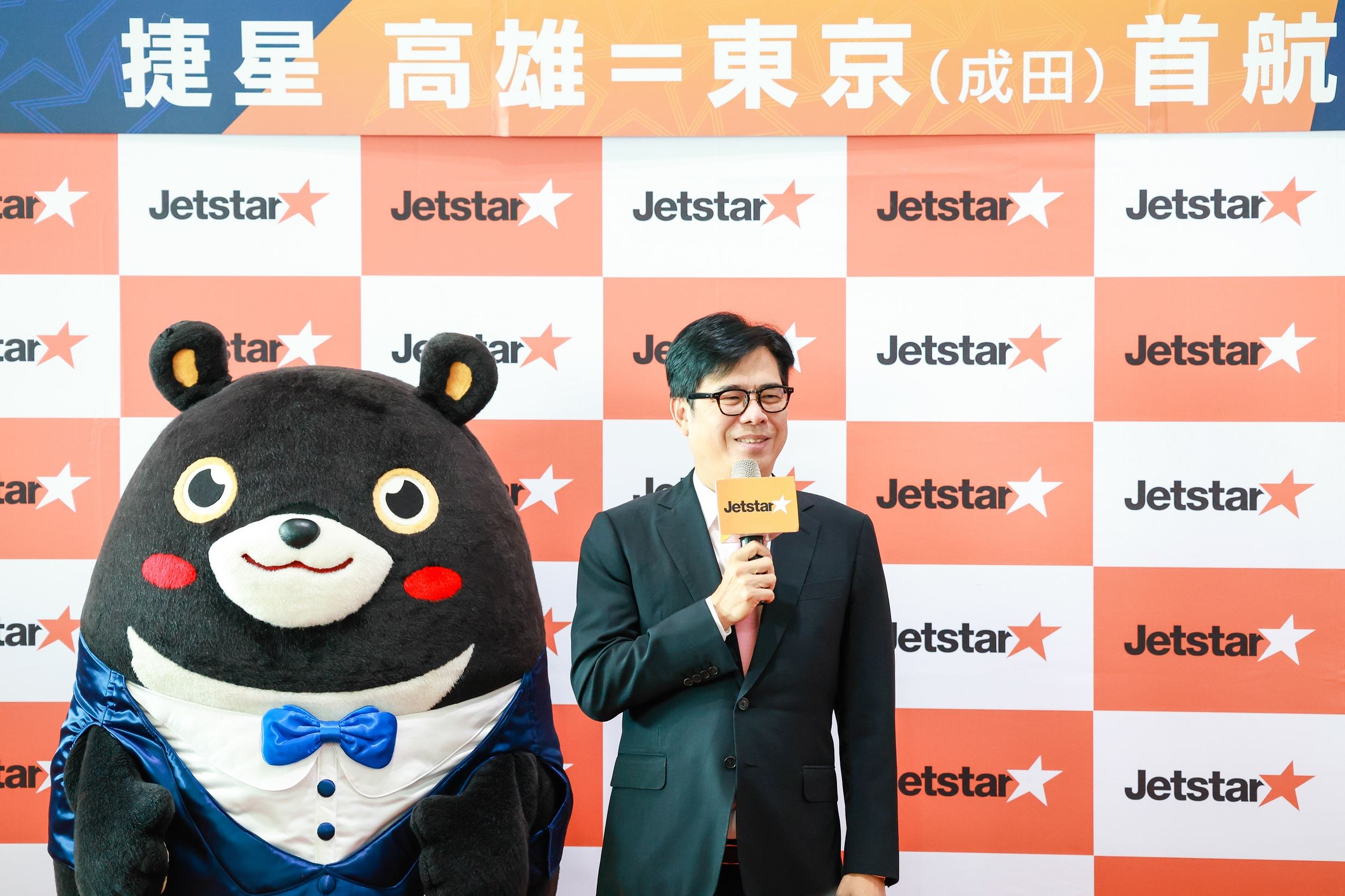 陳其邁也祝福這條航線營運順利、搭乘人數爆滿;最後幽默地表示,捷星日本航空「俗擱大碗又舒適」,歡迎大家多加搭乘。