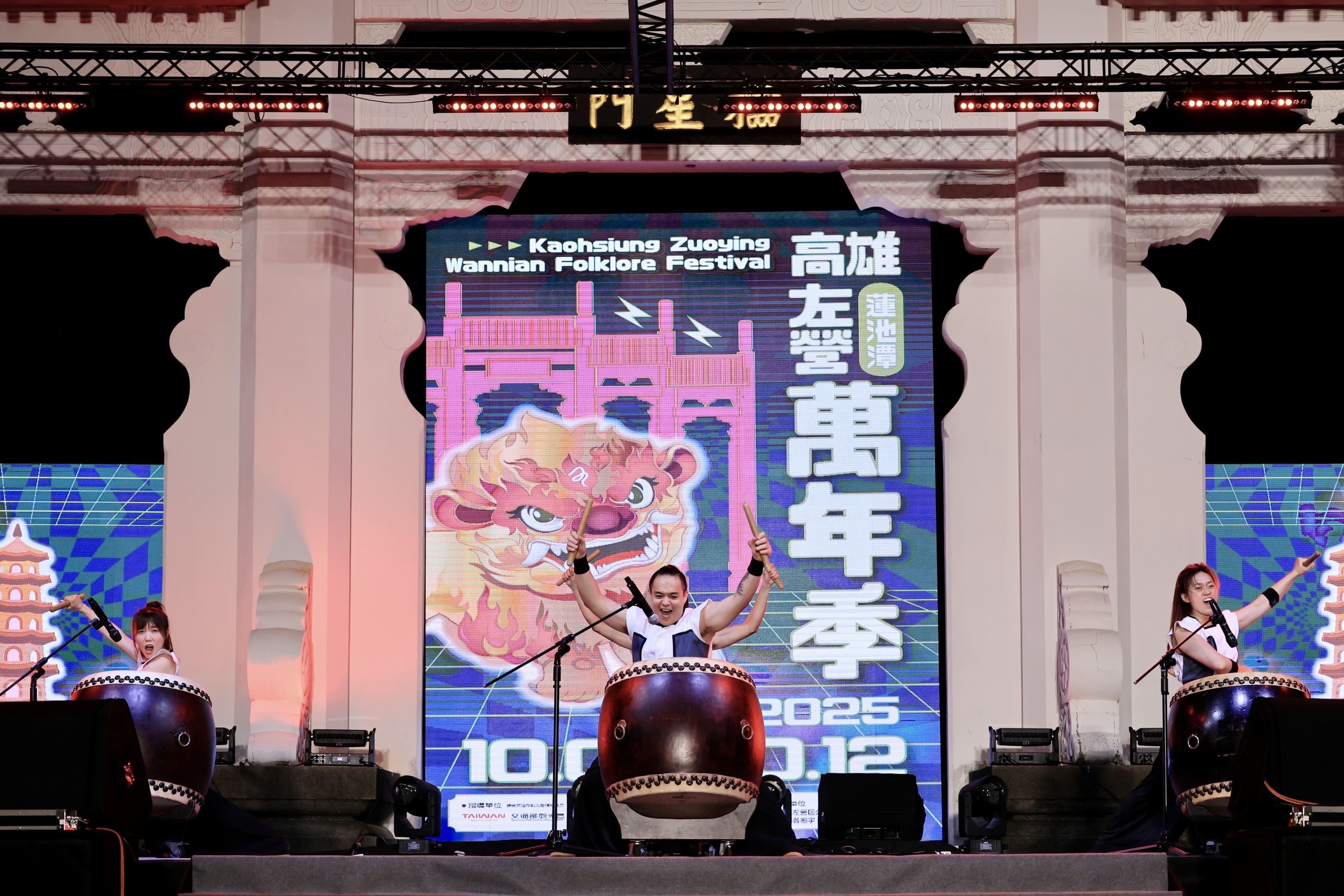 今(10)日晚間的演出由十鼓擊樂團以深具感染力的鼓樂揭開序幕,展現多元魅力與張力;隨後由百大DJ Cookie編製萬年季經典主題曲《花開萬年》,融合電子音樂、嗩吶與鼓陣,搭配Jinbo獨特嗓音,激盪出動感旋律。台灣振宗藝術團帶來女子八家將、官將首、龍陣及醒獅等傳統藝陣,並與紅鼻子馬戲團、虎劇團跨界合作,加入魔幻馬戲雜耍元素。最後,再由十鼓擊樂團以磅礡擊樂收尾,展現傳統與現代、人文與自然的和諧能量,將氣氛推向最高潮。