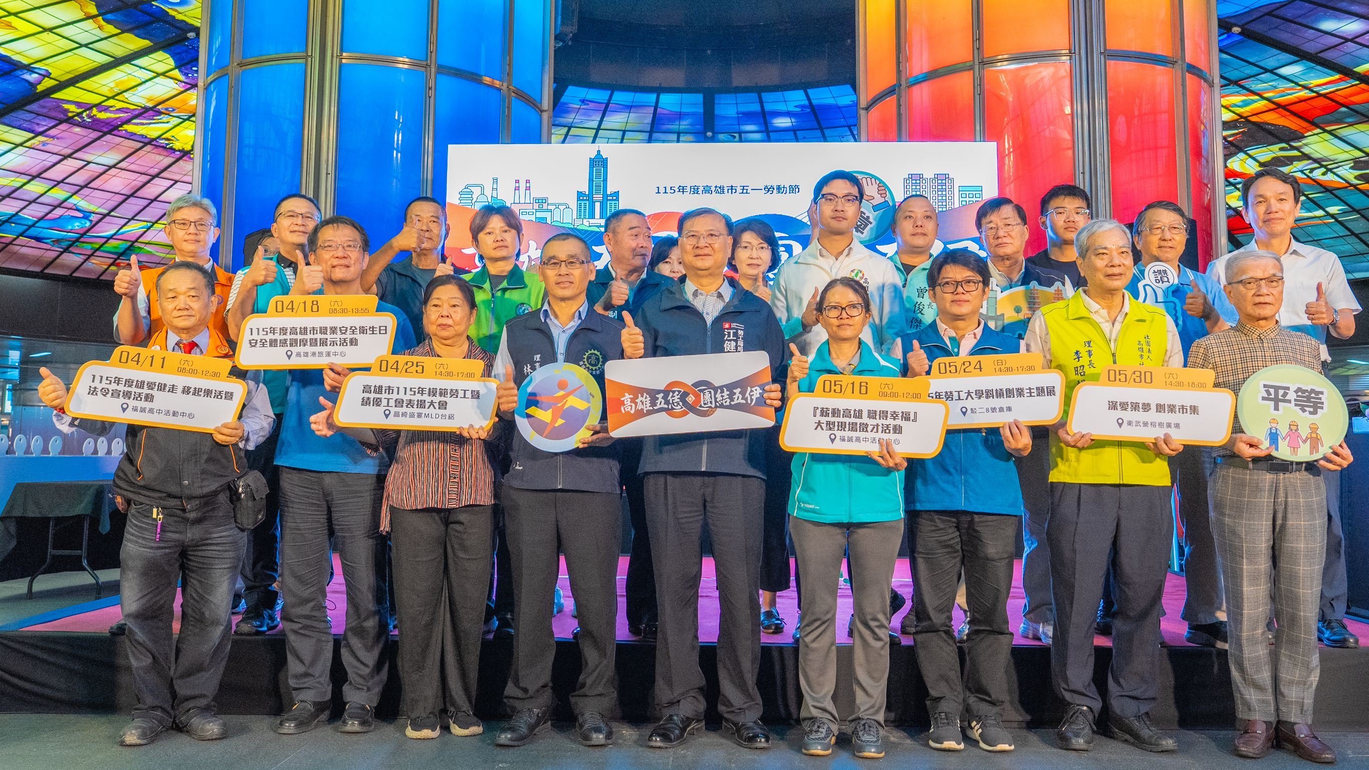 【高雄訊】高雄市政府勞工局今(10)日上午於美麗島捷運站光之穹頂舉辦「115年度五一勞動節系列活動啟動記者會」,為今年五一勞動節系列活動揭開序幕,展現高雄持續團結勞工、促進安全健康與勞動權益、活絡人才培育和就業、力挺弱勢族群、實踐平權城市及社會共好的決心。記者會由江健興局長、高雄市各工會與各界貴賓共同啟動及見證下,宣告活動正式開跑,勞動節系列活動將自4月11日起陸續展開,內容多元豐富,包括「雄愛健走、移起樂活暨法令宣導活動」、「職業安全衛生日安全體感觀摩暨展示活動」、「模範勞工暨績優工會表揚大會」、「薪動高雄、職得幸福—大型徵才活動」、「勞工大學斜槓創業主題展」及壓軸登場的「深愛築夢—創業市集活動」,敬邀勞工及市民朋友踴躍參與,一起響應年度盛事。