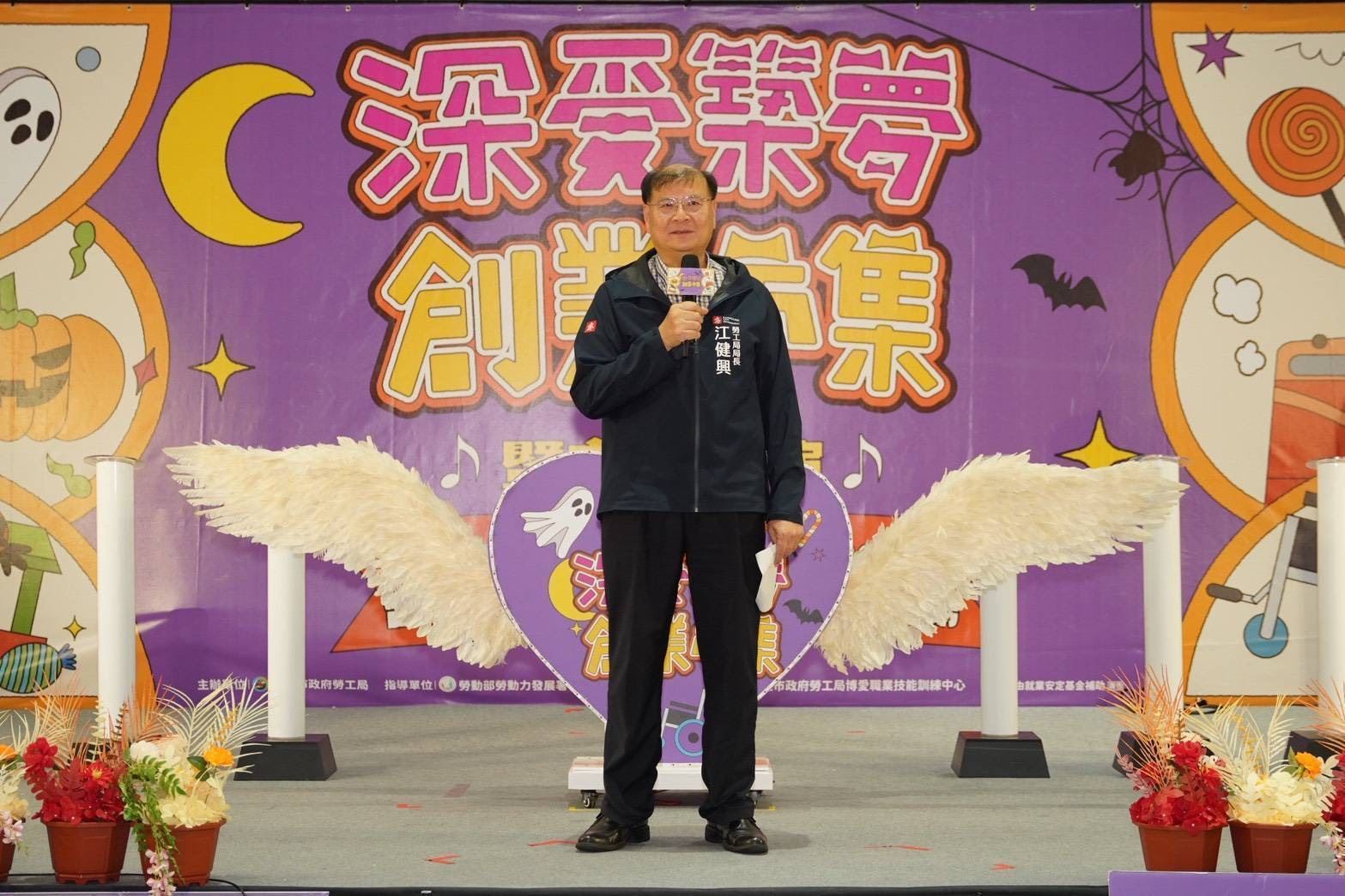 創業市集活動由江健興局長與各社福團體、工會團體貴賓及高雄觀光大使高雄熊共同開場,江健興局長致詞表示,陳其邁市長非常重視身心障礙朋友與弱勢族群的照顧,「深愛築夢創業市集」是勞工局深化身障平權的理念,鼓勵身心障礙者突破障礙勇敢築夢,自112年開辦以來,已邁入第3年,勞工局陸續收到許多正面的回饋與建議,十分感謝大家的支持與鼓勵,未來,勞工局將持續為身障朋友打造更多就業、創業的渠道。今天是本年度「深愛築夢創業市集」的壓軸場,勞工局也擴大辦理規模,更結合高水準的音樂會表演,希望吸引更多民眾前來,共同看見身障朋友的堅持與努力,比起一般人,必須付出更多的辛苦與學習,期盼大家一起給予關懷與支持,讓他們也可以勇敢築夢。