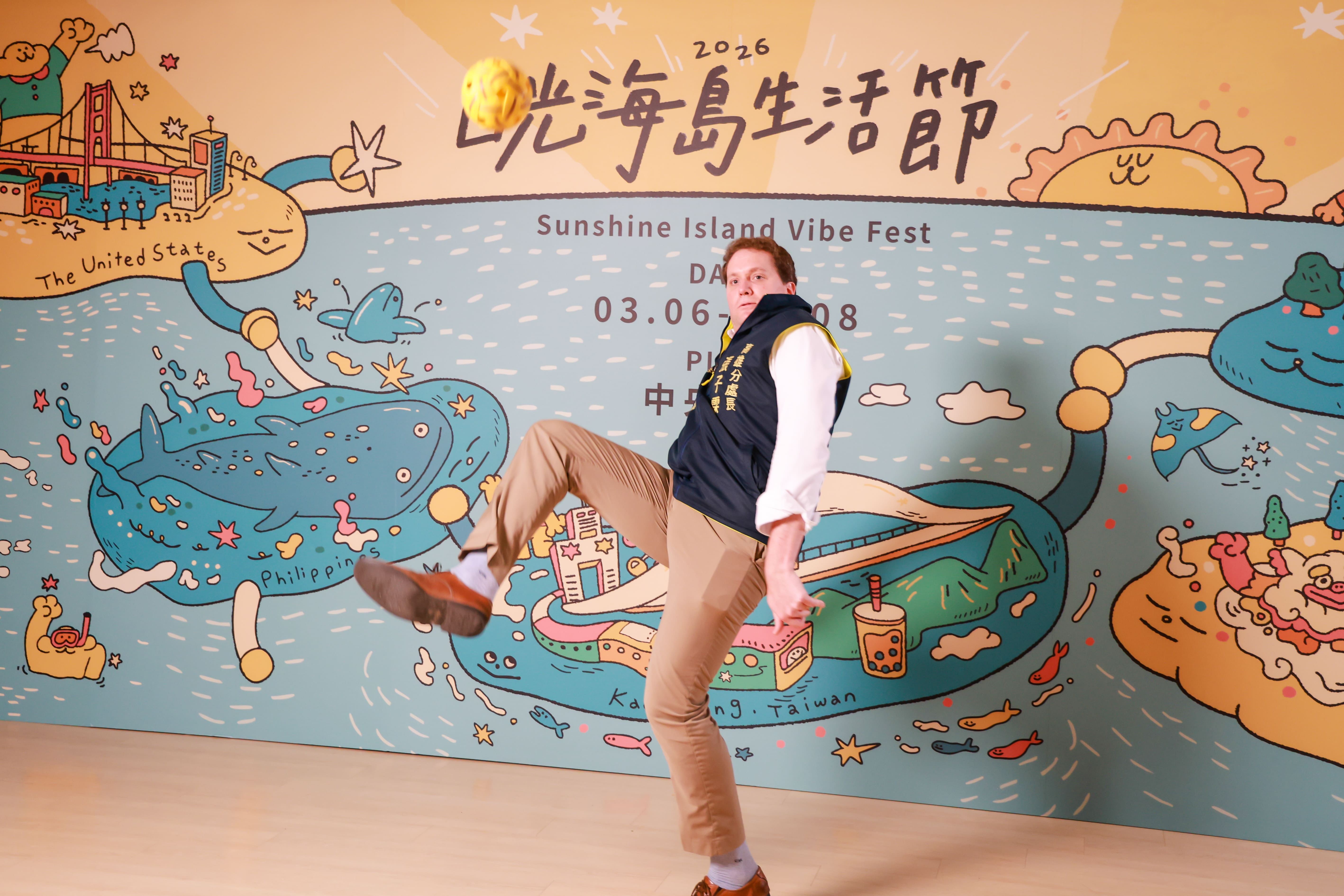 2026日光海島生活節推出更多元的運動體驗,陳其邁與美、日、菲、泰四國駐高代表挑戰藤球運動,邀請民眾一起到現場體驗。「加油!」陳其邁在場邊眾人的加油聲中,比出打氣手勢信心登場,成功回擊多球,氣氛熱烈。日本台灣交流協會高雄事務所所長奧正史(Masafumi Oku)發揮日本「職人精神」,不只盡力以頭部接球,更直接飛撲在地成功救球,隨後精彩回擊,以一記華麗旋身擊球,引來現場陣陣驚呼與熱烈掌聲!美國在台協會高雄分處處長張子霖(Neil H. Gibson)則因一記力道過猛的踢球,藤球差點碰到天花板與攝影機,意外成為全場笑點。馬尼拉經濟文化辦事處高雄分處處長崔瑞霞(Ma. Karina B. Perida-Trayvilla)與泰國貿易經濟辦事處高雄勞工處處長陳燦榮(Nuthchyawach Sanguanchaiyakrit)則自信展現熟練技巧,流暢完成藤球挑戰,獲得滿堂喝彩!