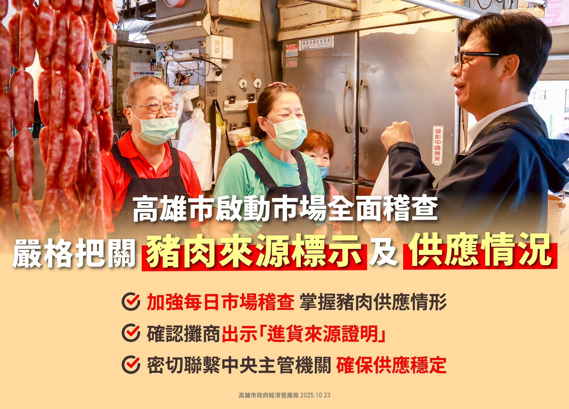 市長陳其邁表示,市府將持續與中央主管機關及供應端保持密切聯繫,掌握貨源動態,確保民生物資供應穩定。同時,市府消保官、衛生局及經濟發展局已派員前往各市場稽查供應狀況,及確認攤販出示肉品進貨來源證明書,嚴格把關。並提醒民眾,屠宰衛生檢查合格的豬隻,豬皮上均會加蓋檢查合格標誌,選購時認明即可安心購買。另貼有CAS標誌的冷凍肉品,亦經屠宰衛生檢查合格,同樣有保障。