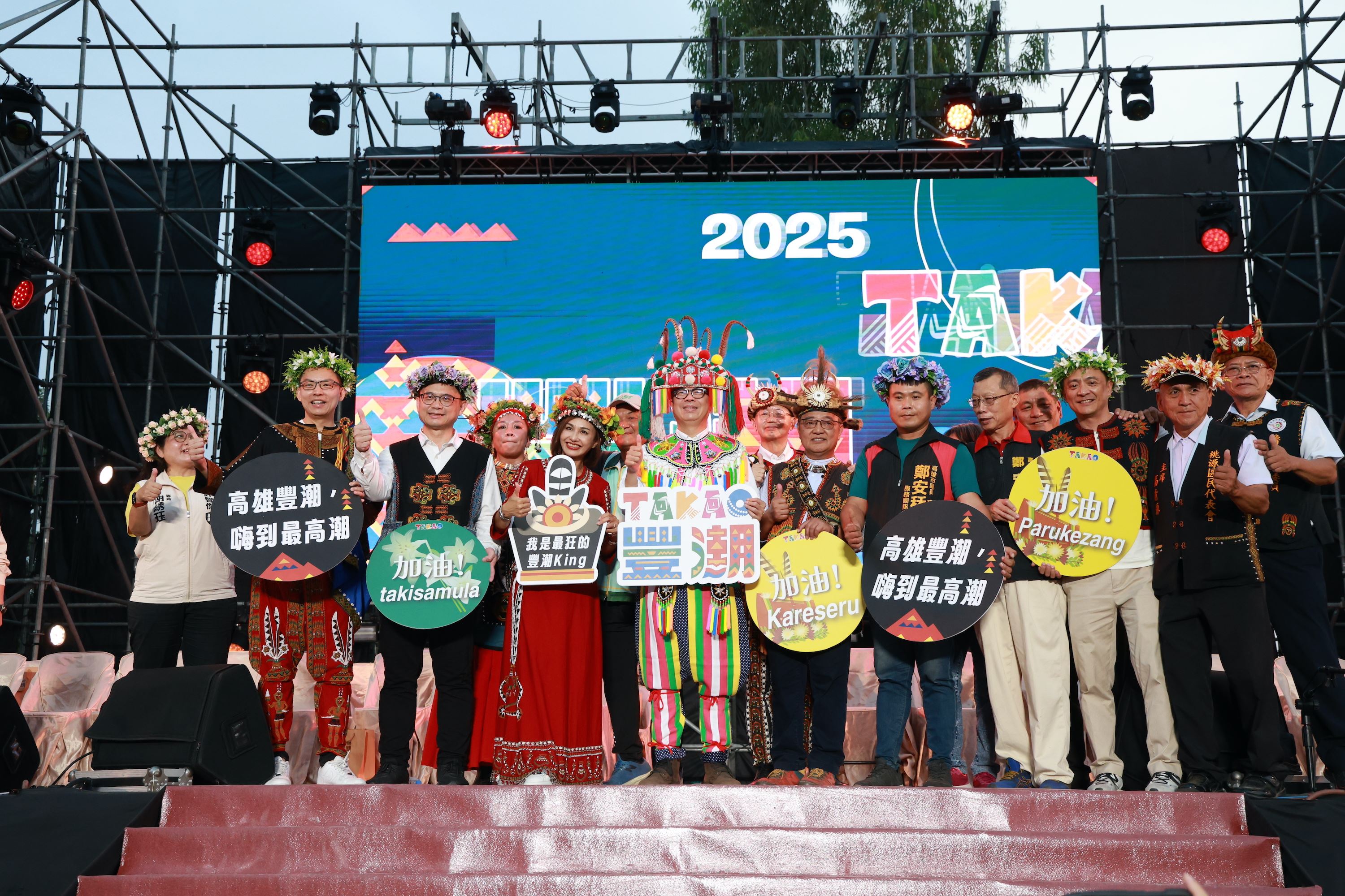 【高雄訊】高雄擁有全國最完整的16族原住民族豐富文化資產,「2025 TAKAO豐潮」原住民族聯合豐年節,創歷年規模最大,於衛武營隆重登場,市長陳其邁今(8)日身穿傳統服飾,與立法委員邱議瑩和賴瑞隆,以及市議員高忠德、陳幸富、范織欽與黃文益一同參與盛會,並加入千人圍舞行列,與林信明總頭目、各同鄉會頭目耆老及族人等,隨著音樂節奏手舞足蹈,高呼「TAKAO豐潮」,氣氛熱烈歡騰。