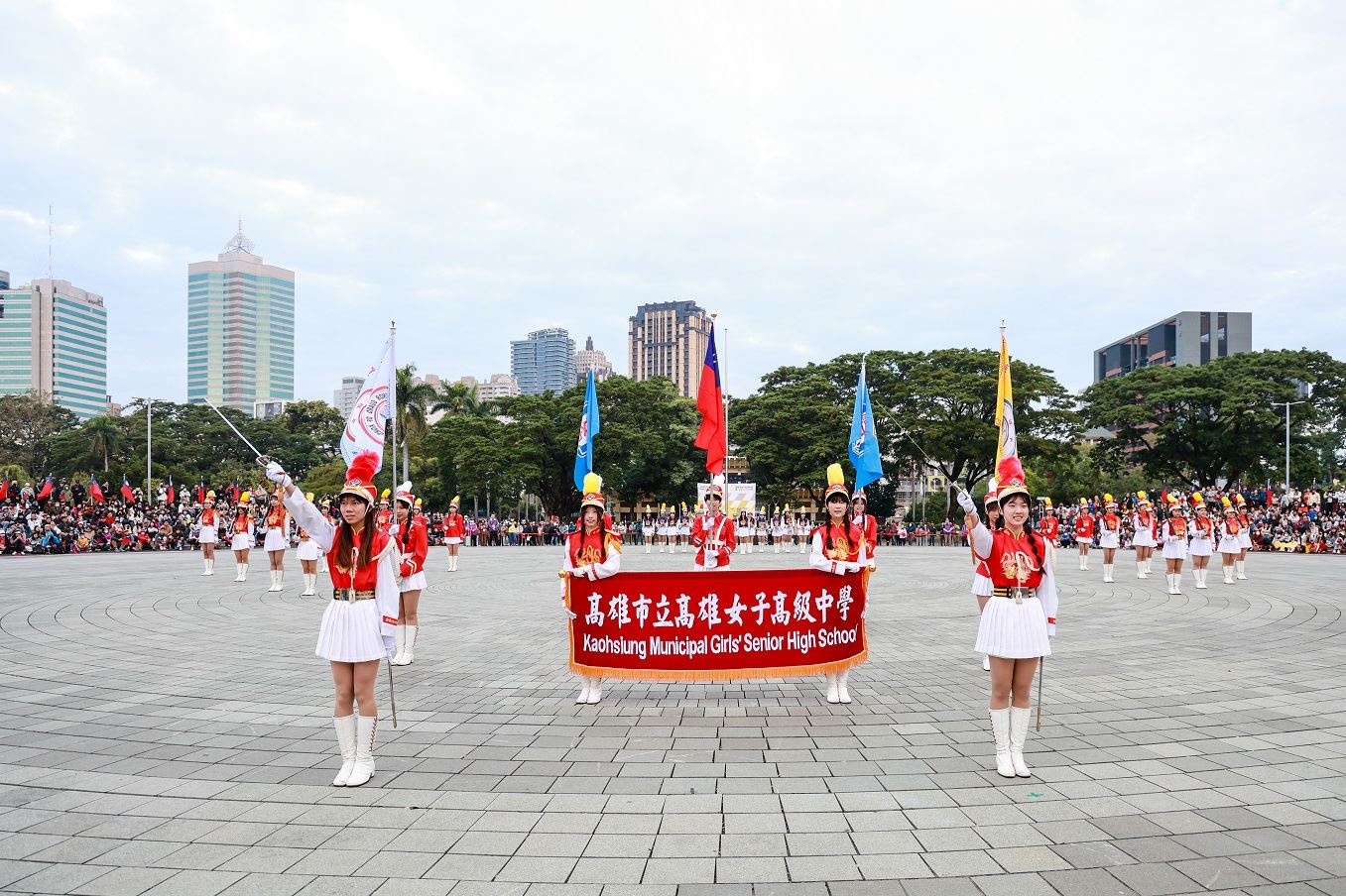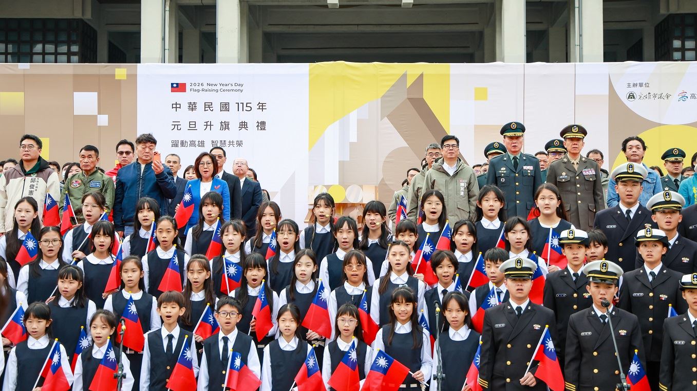 元旦升旗典禮由高雄女中樂儀隊揭開序幕,並結合國軍娃娃活力熱舞與海軍陸戰隊精湛操槍演出。圓形廣場一早就聚集許多民眾,大家齊唱國歌,迎接新年到來。市府民政局表示,今年現場循例發放的一卡通紀念卡,由插畫家馬里斯設計,以童趣的生肖馬為主要元素,搭配燦爛天空、山巒、港灣、建築等圖像,象徵夢想從海港城市啟程奔馳,迎向未來。