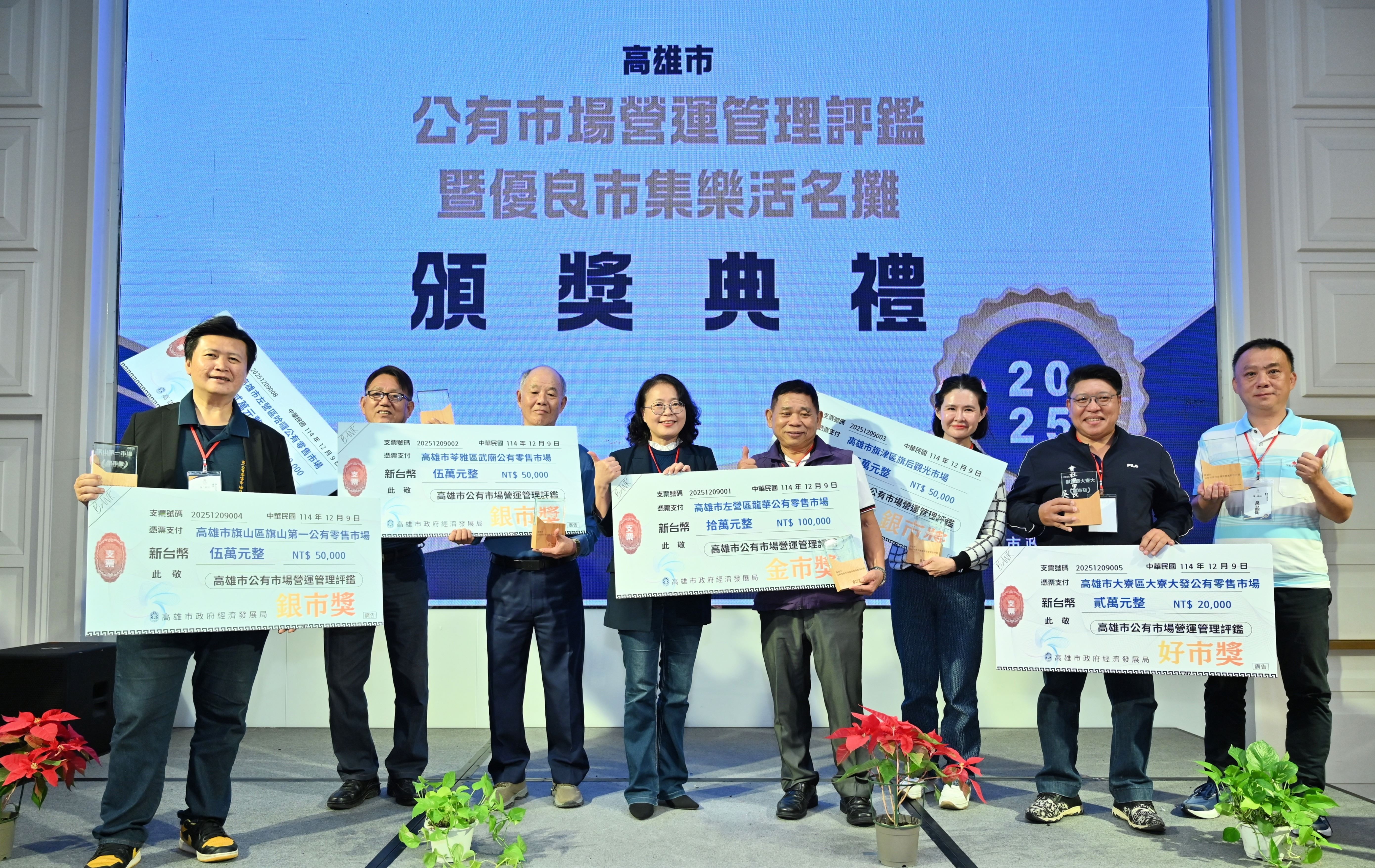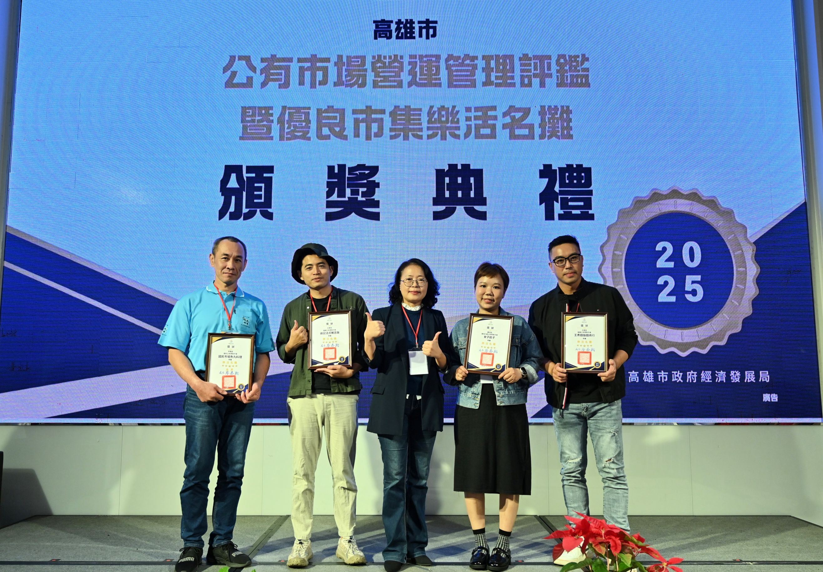 高雄市政府經濟發展局於昨(9)日辦理「高雄市市場環境營運管理評鑑暨優良市集樂活名攤頒獎典禮」,現場各大公有零售市場、攤販集中場管理組織代表及攤商受邀出席,一同分享榮耀與喜悅,並由經發局主任秘書林玉霞頒獎,不僅展現高雄市市集蓬勃發展,更讓外界看見高雄市努力提升市集整體經營品質與績效的成果。