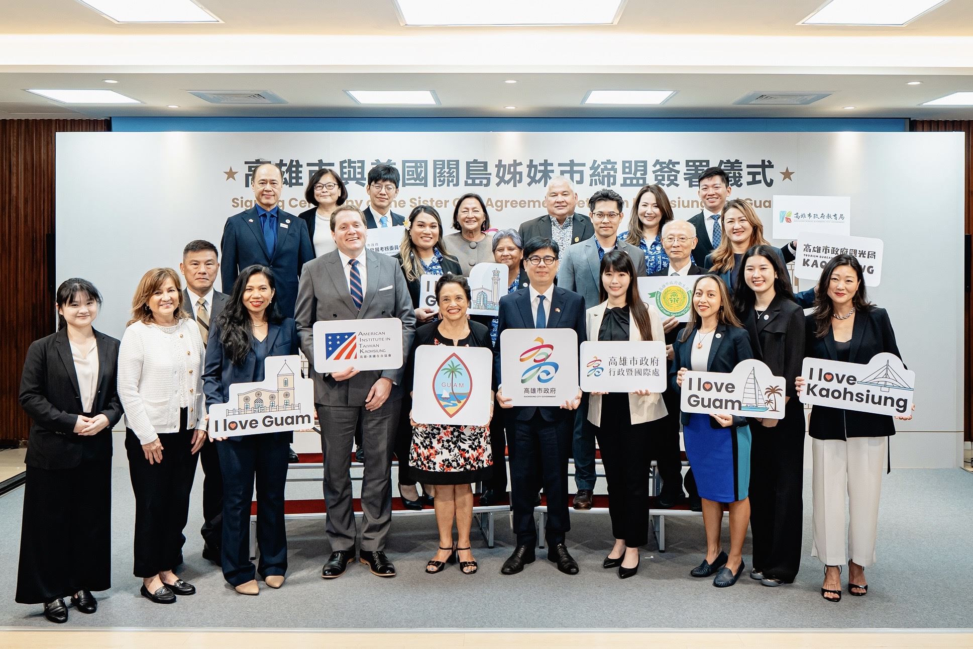 高雄市政府於3月5日與美國關島正式締結姊妹市,由關島總督古蕾露(Hon. Lourdes A. Leon Guerrero)率團訪問高雄,並與高雄市長陳其邁共同簽署姊妹市協定,為高雄深化台美城市外交再添重要里程碑,美國在台協會高雄分處張子霖(Neil Gibson)、外交部駐關島辦事處總領事劉嘉平、聯合航空台灣區業務總經理唐靜儀皆出席見證。高雄市長陳其邁指出,高雄與關島在觀光產業、海洋永續及教育交流等面向具高度互補性,此次締結姊妹市,不僅象徵兩市情誼深化,也為未來合作奠定基礎,雙方將在觀光、文化、教育、農漁業及城市治理等領域展開多元合作。