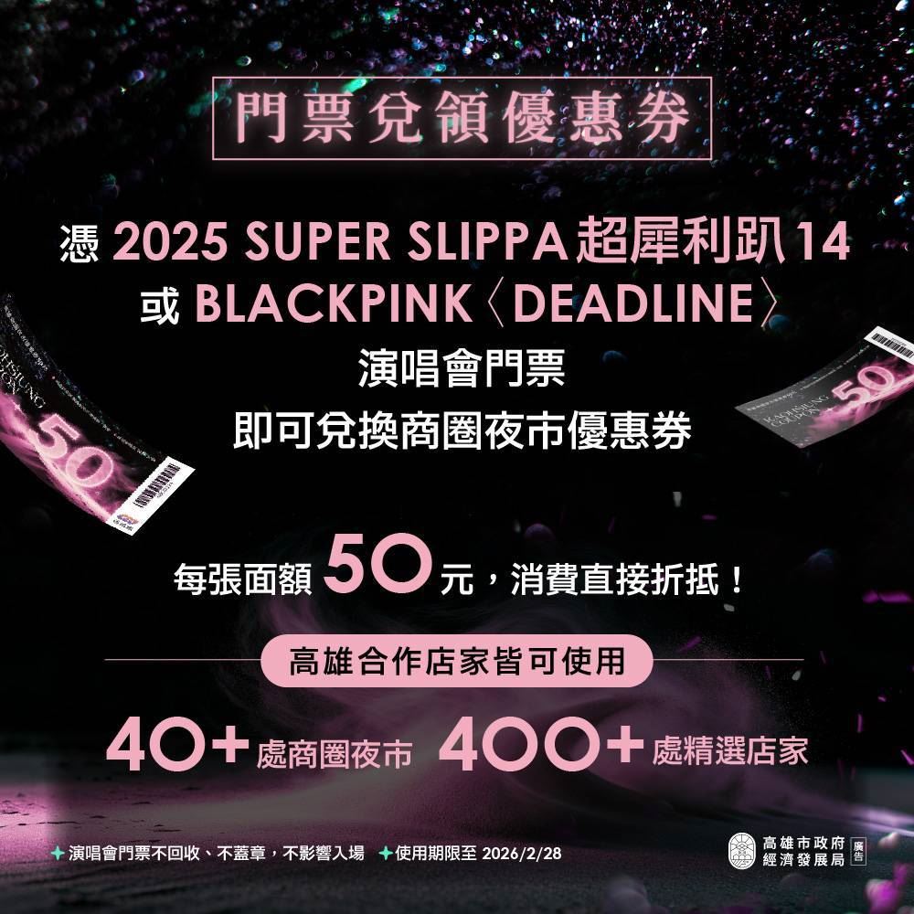 高雄十月份即將迎來備受矚目的演唱會盛事,本週末10月4、5日《2025 SUPER SLIPPA 超犀利趴14》將在巨蛋登場,集結五月天、趙傳、藤岡靛、周湯豪、丁噹等13組重量級卡司,準備為歌迷帶來超夠意思的表演,接續全球大勢女團BLACKPINK世界巡迴《BLACKPINK WORLD TOUR <DEADLINE> IN KAOHSIUNG》將於10月18、19日二度登上高雄世運舞台,再次掀起BLINK(BLACKPINK粉絲名)狂潮席捲全城。市府為熱情迎接逾10萬粉絲到訪港都,持續配合演唱會活動推出面額50元的商圈夜市優惠券,各大百貨業者也紛紛自主響應祭出好康優惠,就是讓樂迷朋友盡情體驗高雄獨特的城市追星氛圍。