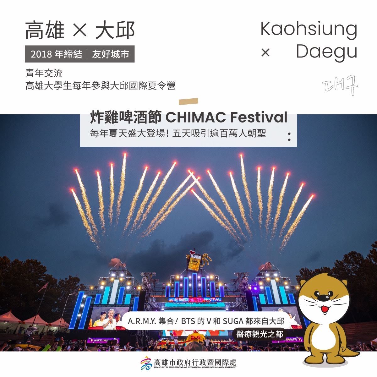 高雄在地表演團體勝秋戲劇團與麒麟原住民文化藝術團近年也受邀登上友好城市大田的年度盛事「零時慶典」,以精湛演出展現高雄多元文化;大邱市亦每年邀請高雄大學生參與國際夏令營,培養青年世代友誼。水原市青年代表團則於今年參訪高雄亞灣新創園,並與高雄青年創業家進行互動交流。高雄亦持續拓展與韓國城市的多元合作,今年3月高雄與韓國高陽市簽署城市合作備忘錄,雙邊透過互訪在智慧城市、教育及產業持續擴大交流。