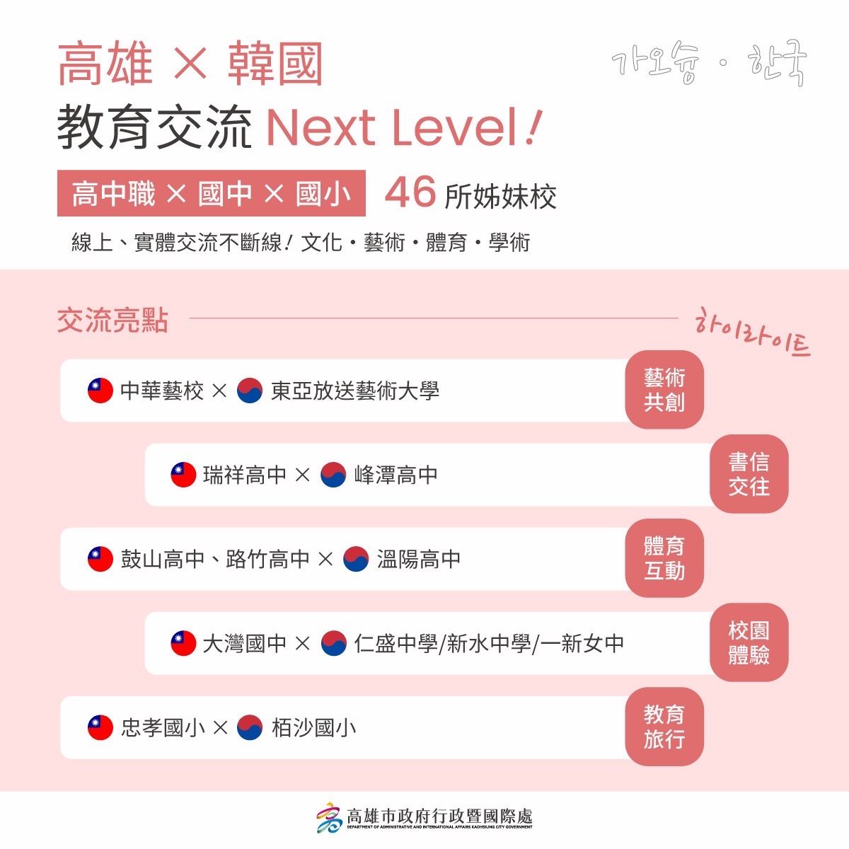 教育局長吳立森表示,過埤國小在2013年與韓國龍湖初等學校締結姊妹校,如今高雄已與韓國建立46所姊妹校。透過線上交流、筆友計畫及實體互動,各級學校在藝術共創及體育交流等面向都有豐富的國際交流。行政暨國際處長張硯卿則指出,高雄致力與國際交流,與韓國城市也發展出深厚情誼,自1966年高雄與釜山締結姊妹市,並拓展至鹽埕區與釜山東區缔結姊妹區,高雄港與韓國最大港釜山港亦成為姊妹港,藉由海港城市緊密連結,持續深化交流。