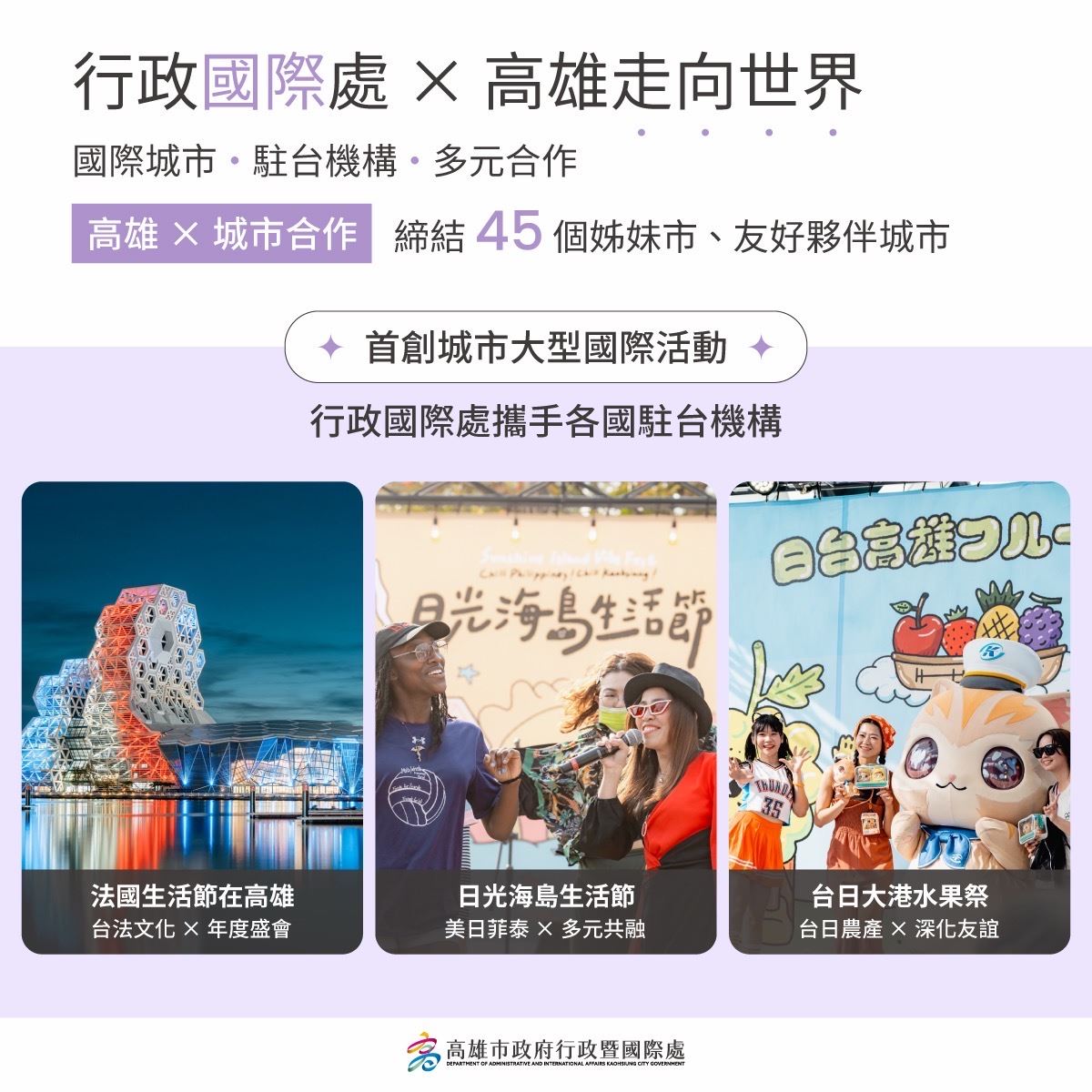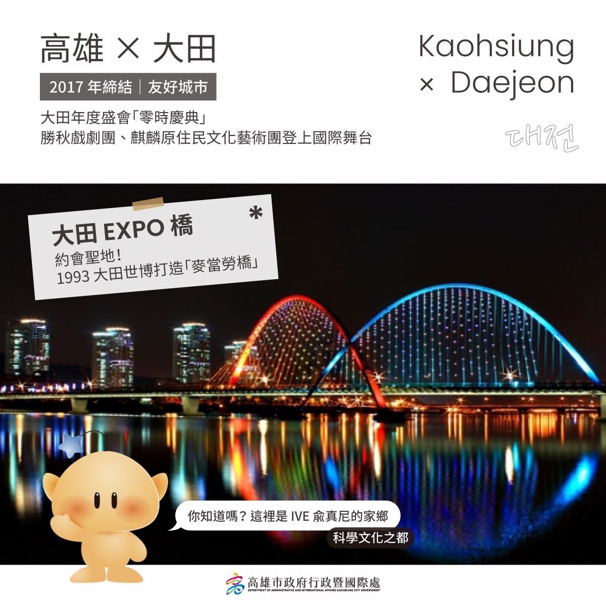 隨著多組韓國天團接力選擇高雄開唱,高雄已成為粉絲追星熱點,不僅演唱會及應援活動帶來城市關注熱度,高雄市政府也積極將國際交流推展至校園內!高雄市過埤國小在校長郭榮全帶領老師用心設計下,透過韓國城市主題裝置及韓國文化體驗活動,讓學生在趣味中更認識高雄在韓國的姊妹市與友好城市最新交流,高雄市政府教育局長吳立森及行政暨國際處長張硯卿也親自參與,與學生一同在趣味中培養國際視野,期盼深化台韓友好,在校園向下扎根。