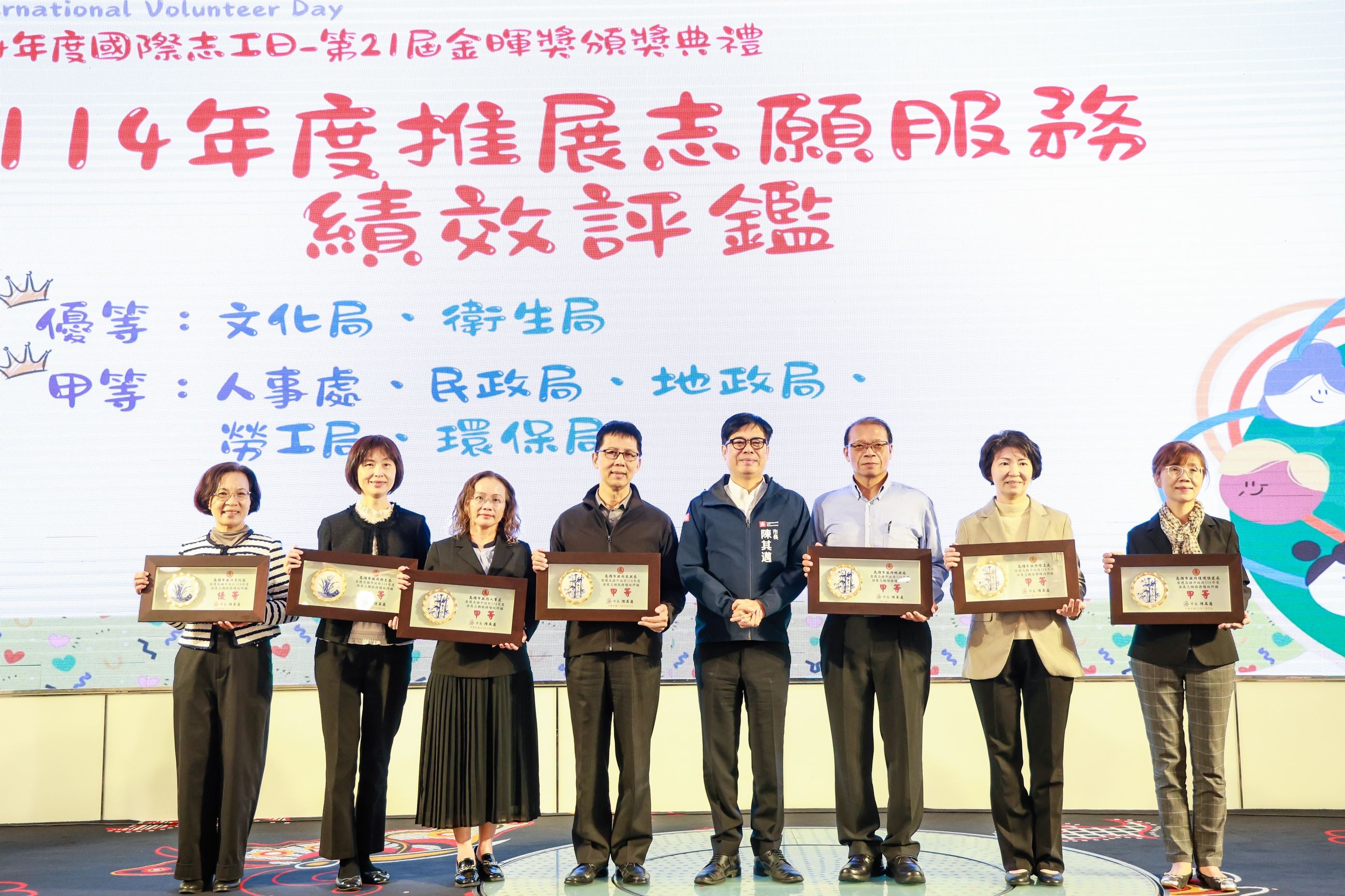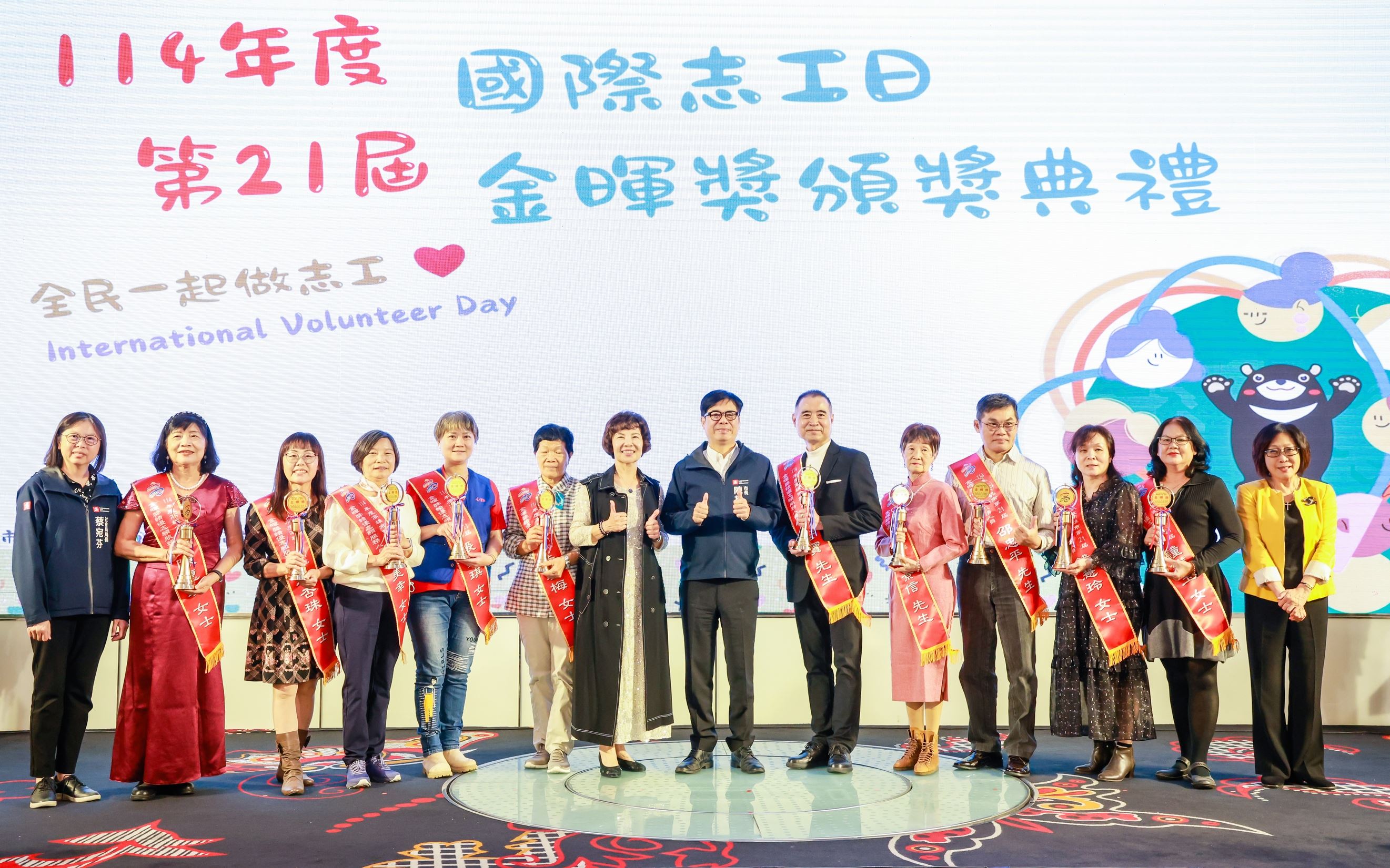高雄目前擁有超過1,300支志工隊、逾11.7萬名志工投入多元領域服務,今年共有24位志工、8個志工團體及5個家族獲頒「金暉獎」,同時也頒發績優人員、團隊、企業及家庭等共37個獎項,肯定互助精神讓高雄樂活安居。