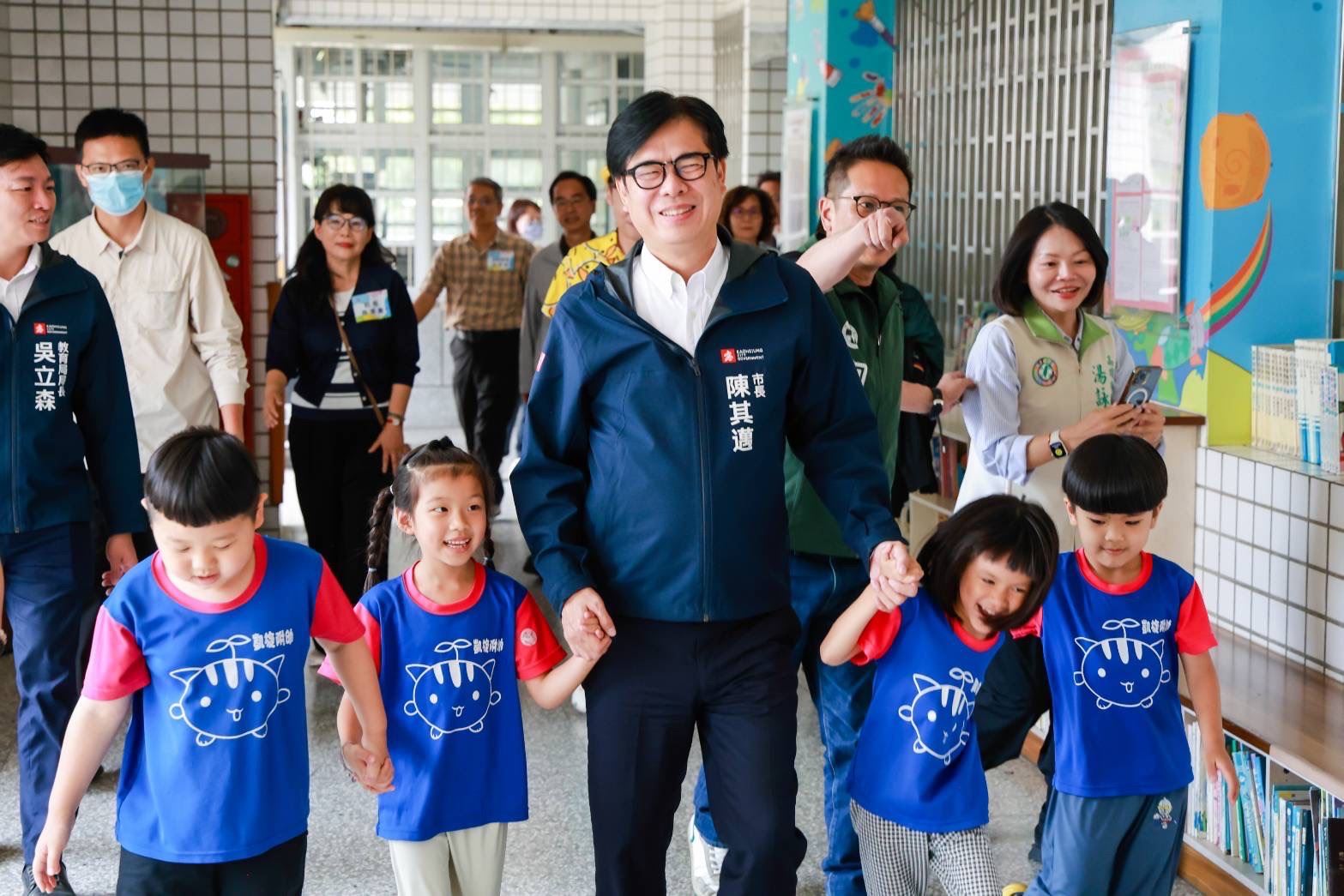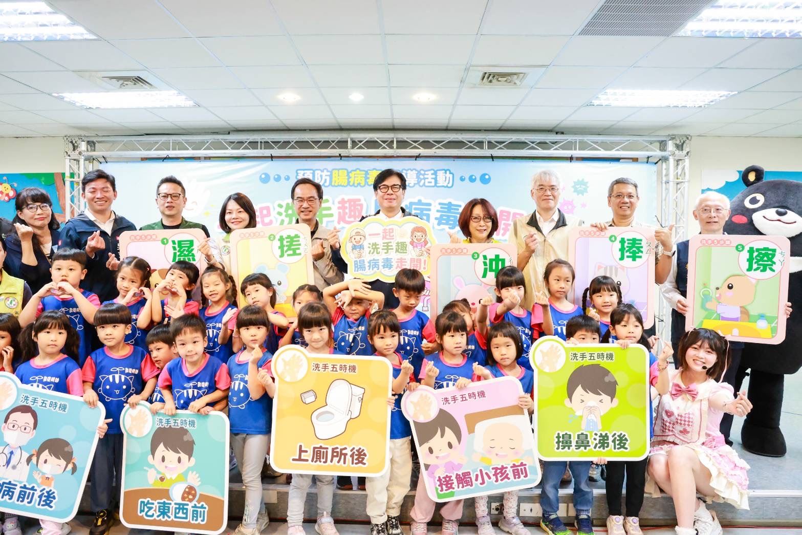 【高雄訊】為守護幼兒及學童健康,防範腸病毒疫情流行,高雄市長陳其邁今(21)日出席凱旋國小「一起洗手趣,腸病毒走開」宣導活動,與高雄市議會議長康裕成、多位民意代表及深受小朋友歡迎的高雄熊一起帶動唱跳「洗手歌」,並與小朋友共同示範正確洗手5步驟「濕、搓、沖、捧、擦」,用實際行動守護孩童健康。