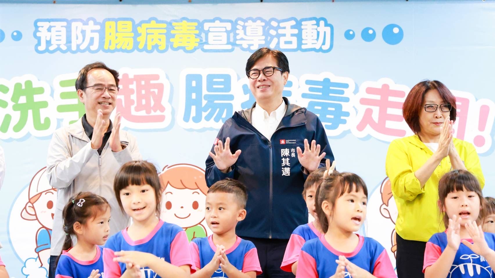 市長陳其邁強調,使用酒精或乾洗手無法有效消除腸病毒,他呼籲學校、家長應定期進行環境清潔與消毒、維持良好衛生習慣,並落實以肥皂勤洗手等作為,才能有效清除腸病毒,守護家中寶貝的健康。