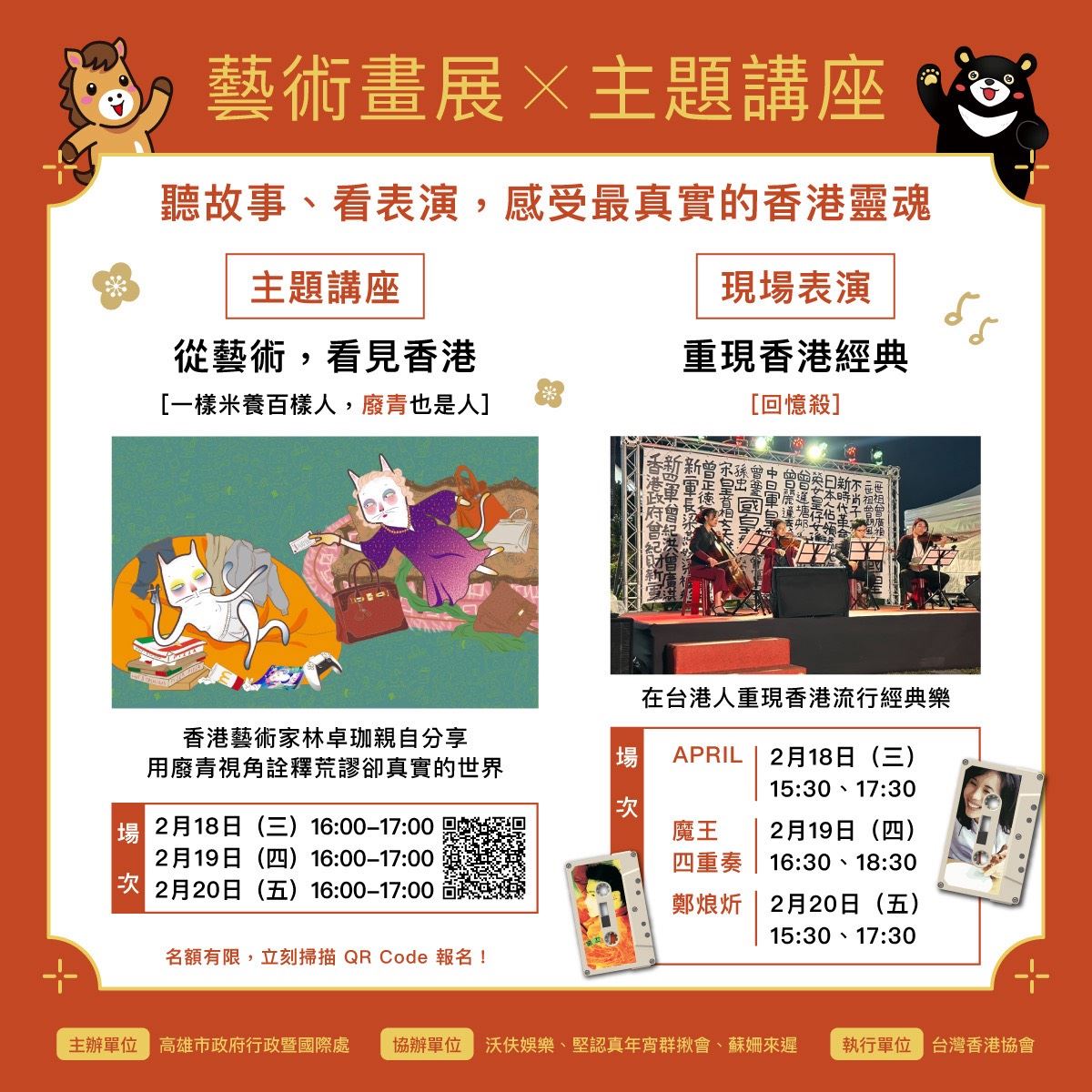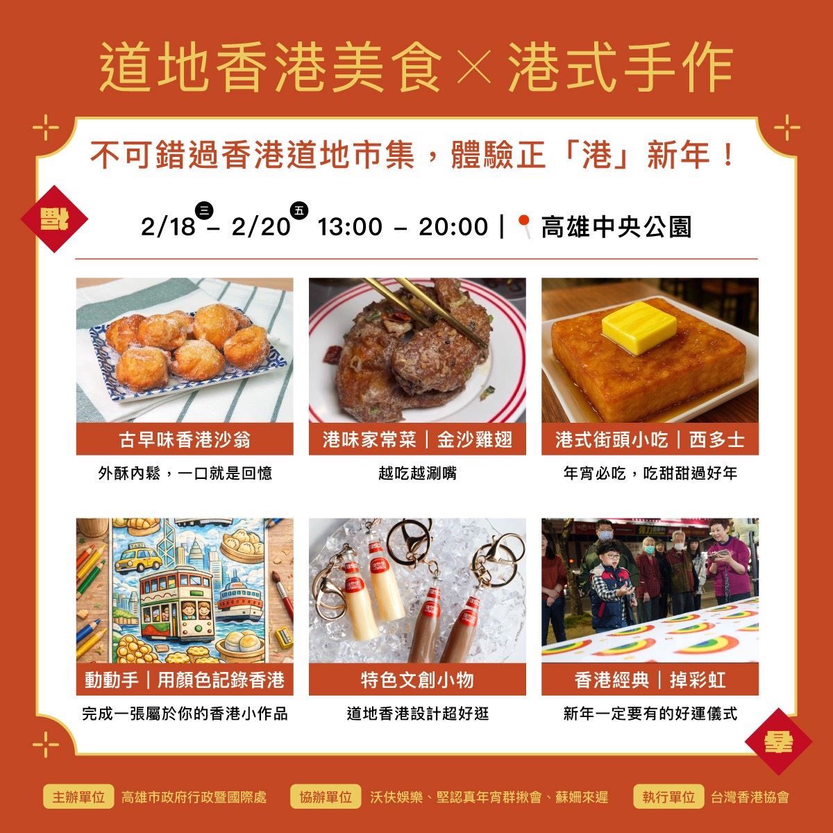 「2026香港年宵在高雄」將於2月18日(大年初二)至2月20日(大年初四)於高雄中央公園熱鬧登場。由高雄市政府攜手台灣香港協會共同舉辦,活動邁入第4年,歷年皆吸引大批民眾參與,已成為高雄春節期間重要的多元文化交流盛事。今年活動結合市集、音樂演出、藝術展覽、足球工作坊與文化講座等豐富內容,邀請市民在春節連假期間走入香港年節文化,體驗高雄限定、港味十足的節慶氛圍。
