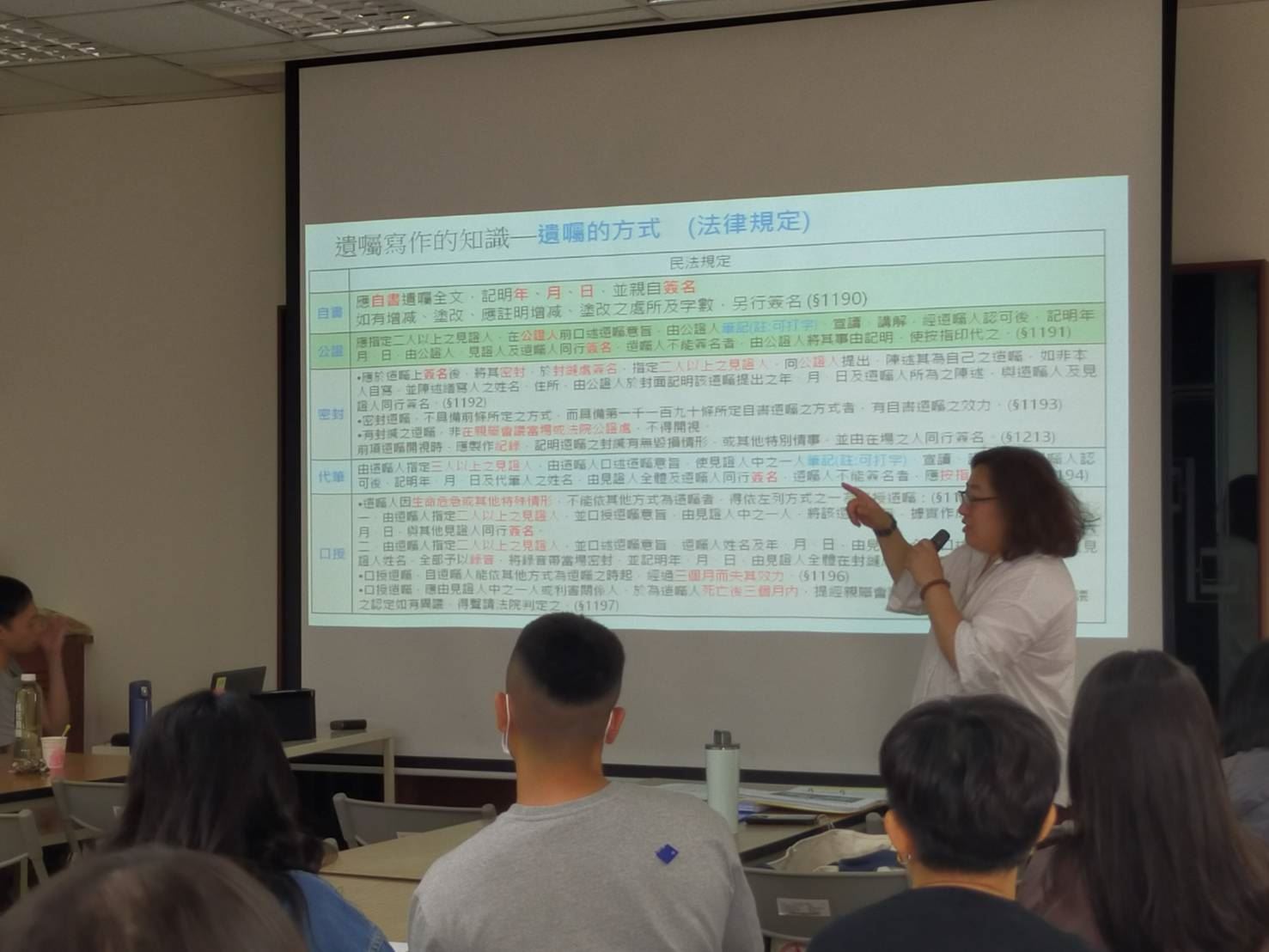 講座中,洪律師以深入淺出的方式,詳細剖析各種親屬、繼承及遺囑訂立的法律程序、效力要件及常見的法律誤區。特別是,他結合多個實際案例,並現場示範自書遺囑的正確書寫方式及各種繼承態樣,使平日面對民眾洽辦繼承、公證等業務的戶政同仁,能更清楚、精確地掌握如何協助民眾以合法、有效的方式處理死亡登記、戶籍謄本等等。