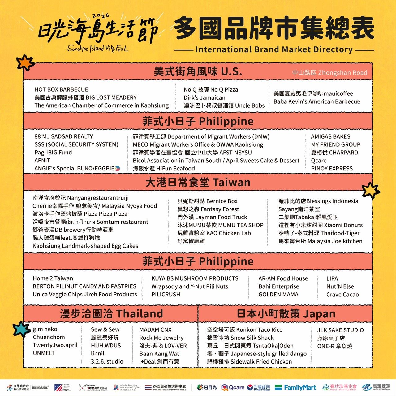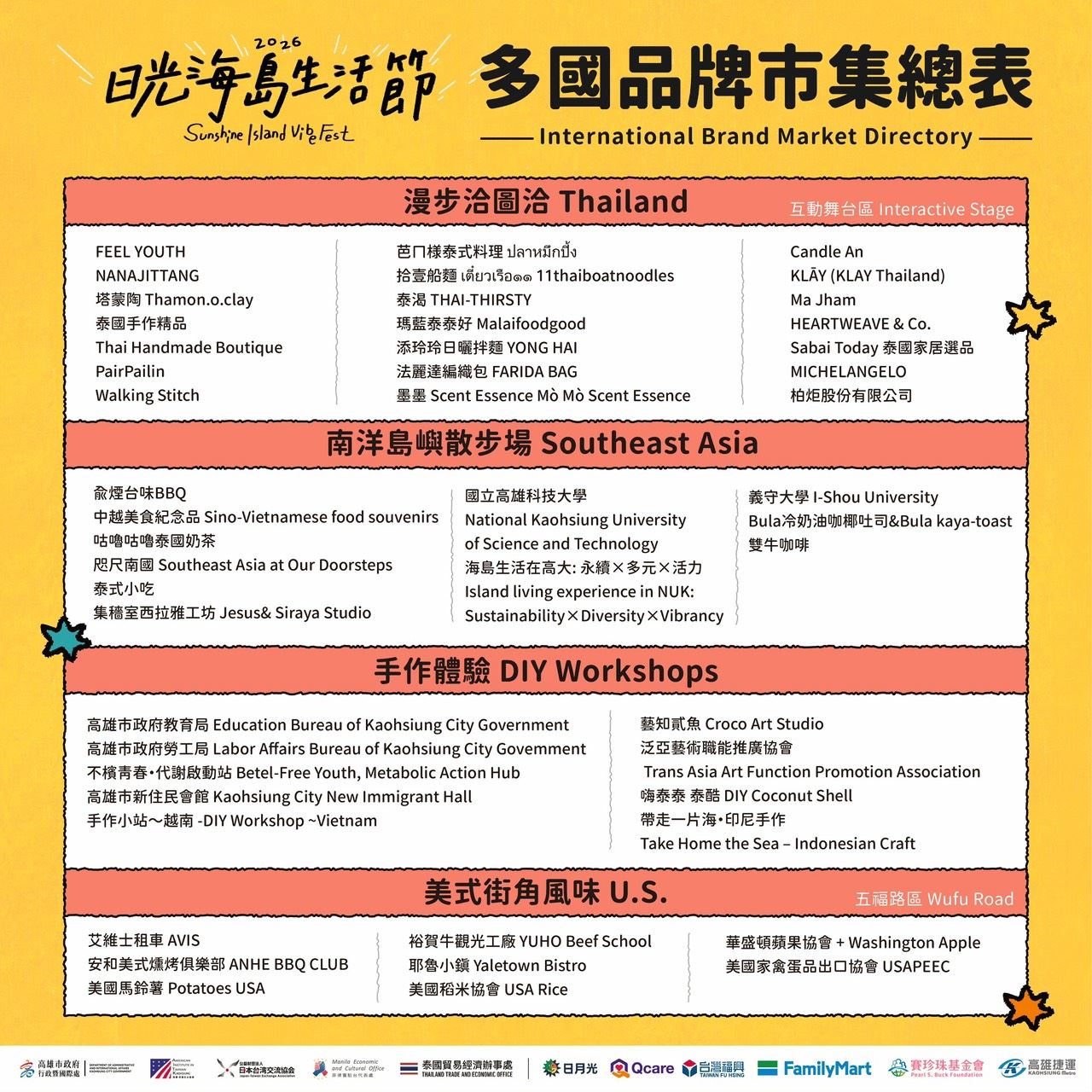 「2026日光海島生活節」由高雄市政府行政暨國際處、美國在台協會高雄分處、日本台灣交流協會高雄事務所、馬尼拉經濟文化辦事處高雄分處及泰國貿易經濟辦事處共同合辦,特別感謝日月光、葵爾特國際企業股份有限公司、台灣福興文教基金會、全家便利商店、賽珍珠基金會及高雄捷運公司等單位熱情支持。