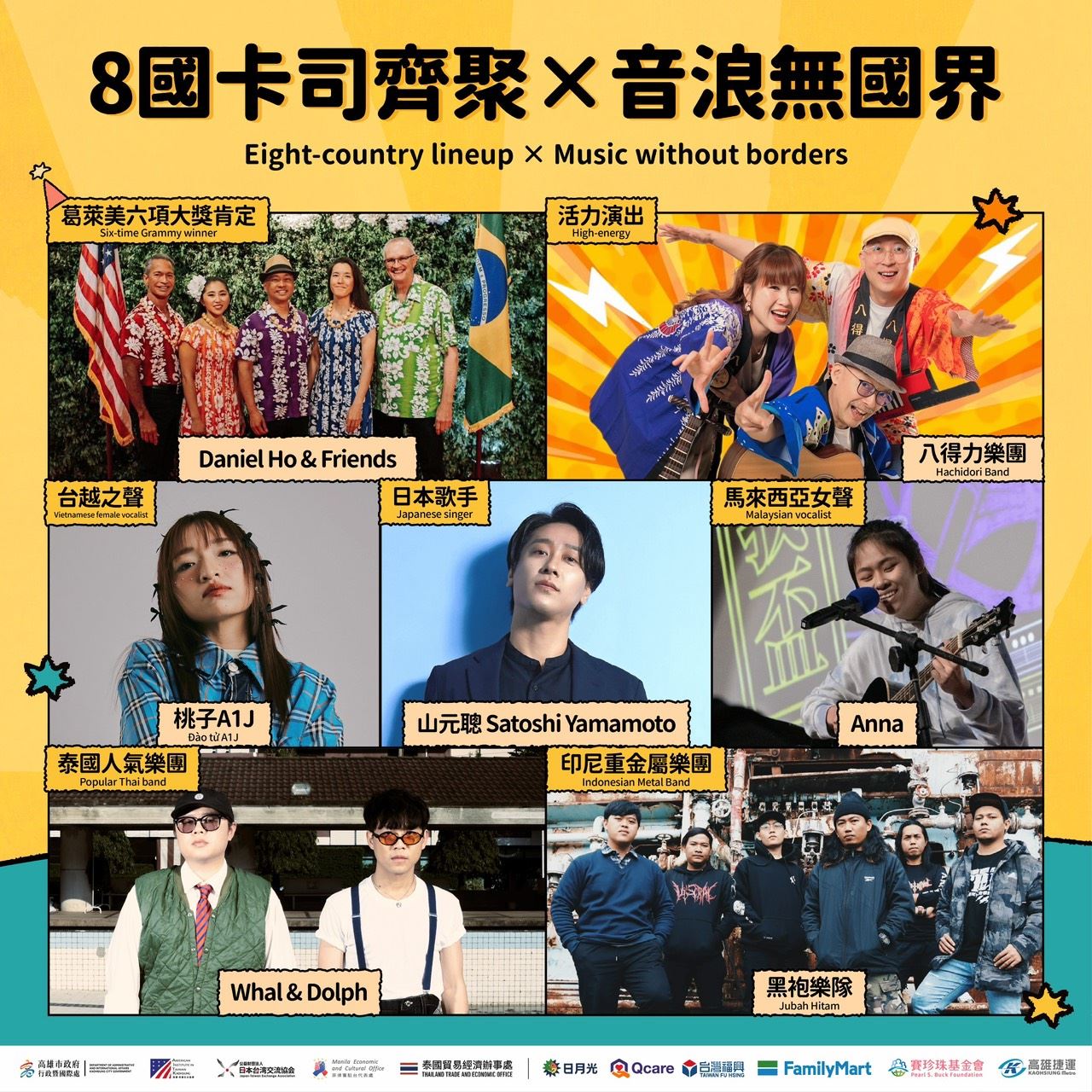 今年八國演出卡司更勝去年,邀請葛萊美六冠得主 Daniel Ho & Friends 以及滅火器、美秀集團、芒果醬等人氣樂團接力開唱;另有尼布恩合唱團、台鋼集團啦啦隊與吉祥物TAKAO、高雄捷運蜜柑站長、泰國樂團 Whal & Dolph、印尼重金屬樂團黑袍樂隊及日月光推薦人氣表演團等輪番登場,國際與在地文化交織,帶來高規格音樂盛宴。