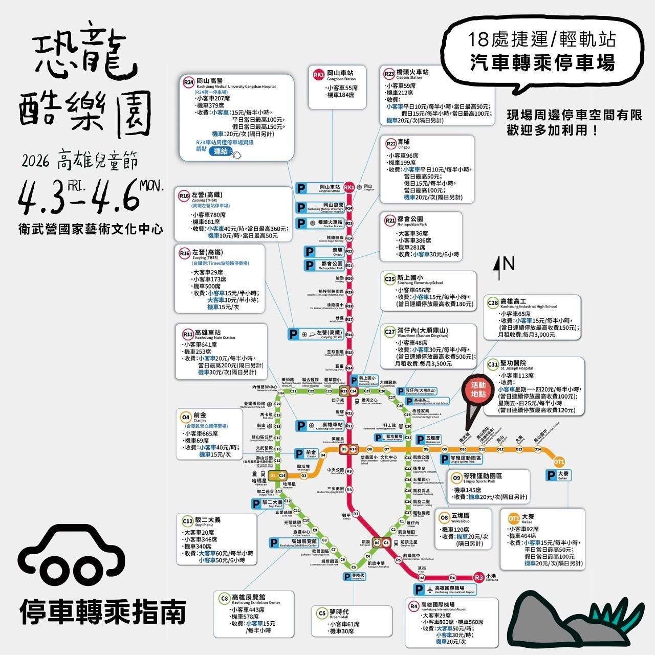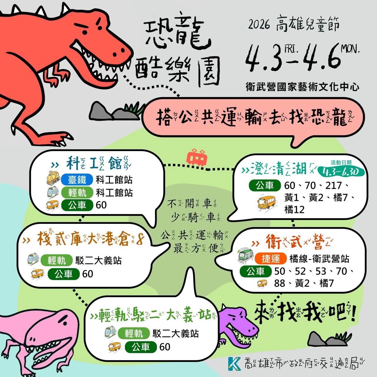 高市府表示,今年兒童節除於衛武營舉辦系列活動及設置「恐龍大草原」外,也在輕軌駁二大義站與澄清湖等地設置仿真恐龍打卡點,並由國立科學工藝博物館舉辦「恐龍童樂大冒險」活動,邀請民眾全家出遊尋找城市各地的恐龍,歡度兒童節假期。