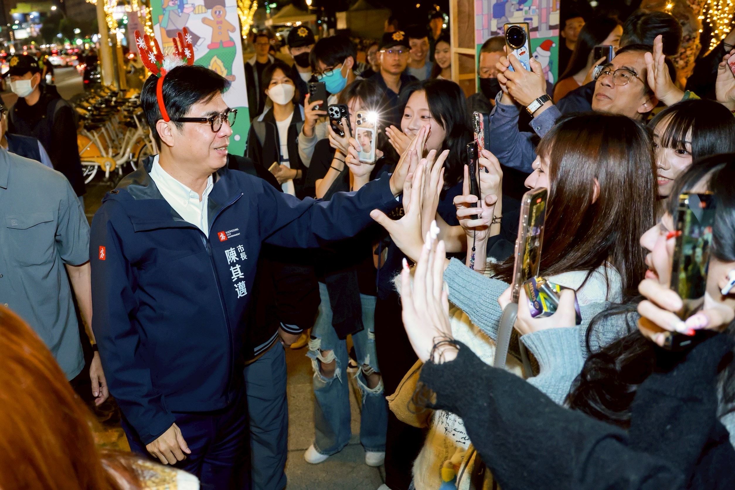 【高雄訊】天氣轉冷,眾所期待的聖誕節也即將到來,高雄聖誕生活節大家期待以久的26米高永恆星冠聖誕樹今晚由市長陳其邁點亮,瞬間閃耀整座中央公園,而中山路兩側整排的聖誕串燈更凸顯城市裡浪漫溫馨的過節氛圍,高雄熊也戴上聖誕頭飾,和陳其邁在現場和遊客同樂。即日起至明年1月4日,每天傍晚17時30分至晚間24時,中央公園的聖誕燈光裝置都將點亮,聖誕主燈區每30分鐘更有煙霧雪花飄落,搭配燈光變化和聖誕節慶氛圍滿滿的音樂,相信都將讓現場民眾驚呼連連。接下來還有多個周末將有中央聖誕小鎮市集及高雄聖誕生活節系列精彩活動登場,歡迎市民朋友到中央公園歡樂過聖誕、相聚跨年。