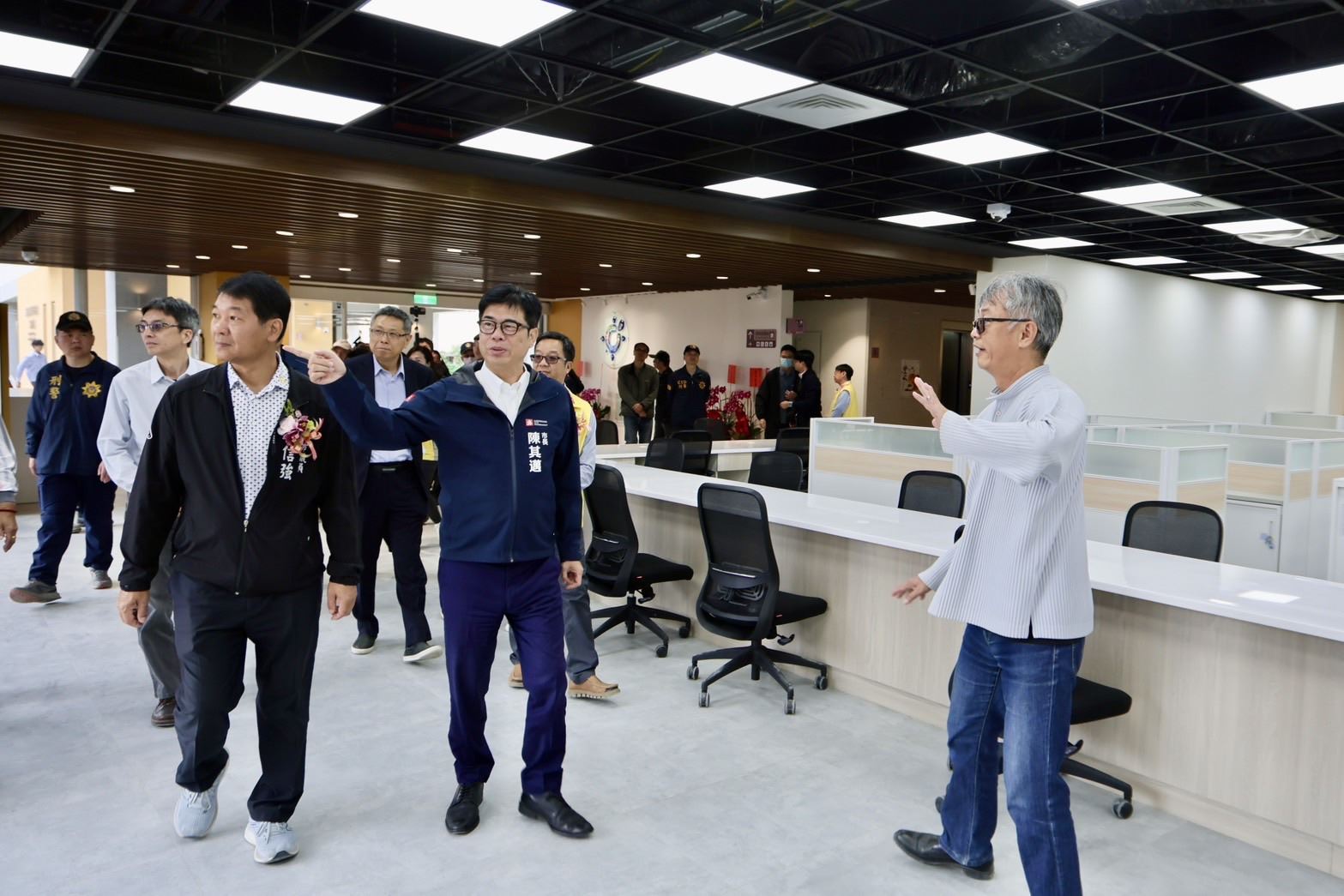 陳其邁回顧任內多次因救災來到六龜,關心風災疏散作業,強調六龜雖地處偏遠,但市府從未忽略地方需求,除區公所外,本次戶政事務所與周邊環境也一併改善,打造兼具行政服務、防災收容與社區功能的優質公共空間。隨後他參訪新落成的辦公廳舍與畫展,並與清潔隊員合影留念、互相加油打氣,氣氛融洽。