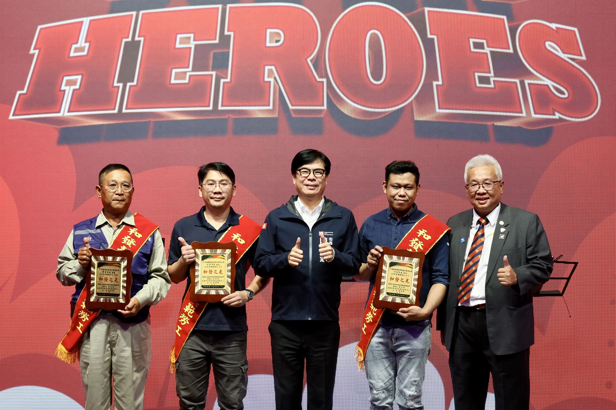 陳其邁逐一頒獎表揚12位特殊貢獻獎得主,其中包含4位外籍勞工。來自越南的黎文慶自103年來台服務,熟稔自動化設備操作,能即時發現異常並有效降低故障率,亦積極培育新進人員、促進跨國同仁合作,從基層逐步升任副課長;印尼籍阿古斯來台服務已邁入第10年,工作認真、配合度高,與同事互動良好,表現優異,現任副組長。