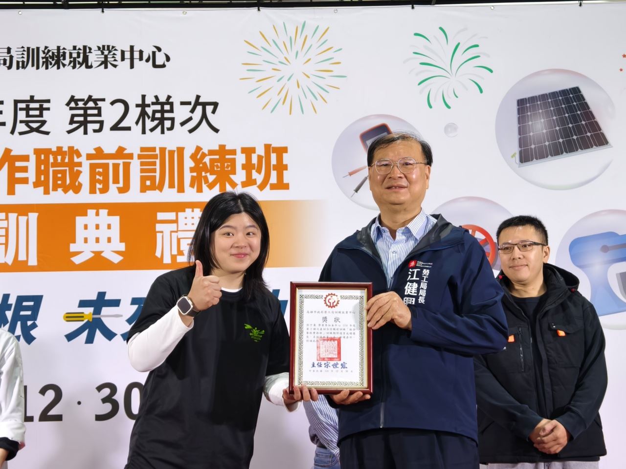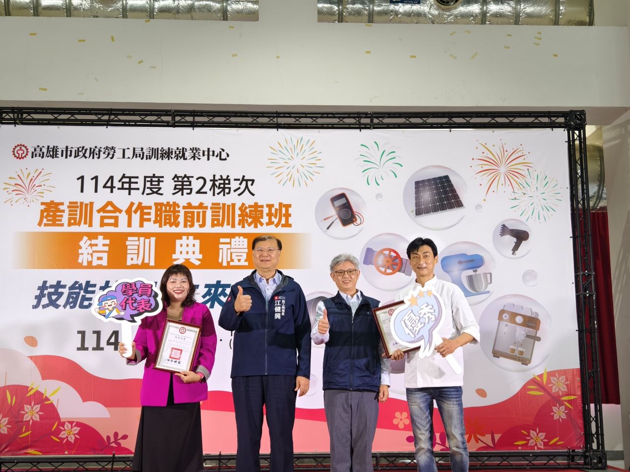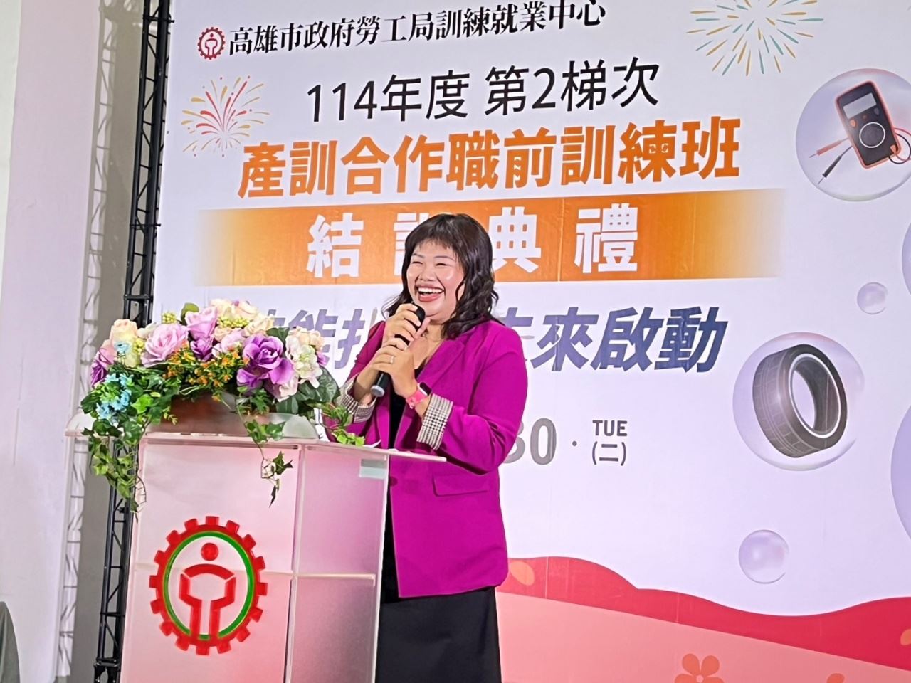 【高雄訊】高市勞工局產訓合作訓練班於今(30)日舉辦結訓典禮,共計137位學員順利學成結訓,典禮以「技能扎根,未來啟動」為主題,意喻學員經過4個月的學習磨練,習得一技專長,讓技能成為未來的發電機,在職場上重新啟動,綻放自我光彩。江健興局長恭喜學員們即將展翅迎接職涯新旅程,期許面對未來新的職涯階段,要相信自己的能力,不要害怕挑戰和困難。江局長表示,受訓期間透過每天累積的努力與進步,就是在為技能扎根打基礎,讓未來可以更穩、更有力量。現今職場環境變化快速,而在產訓班學到的,不只是一項技能,還包括面對變化與困難的勇氣及韌性,勉勵學員持續學習,不論是就業、轉職、創業,甚至跨領域發展,都能以今天的成果為起點,勇敢去挑戰、去實踐未來的夢想與目標。