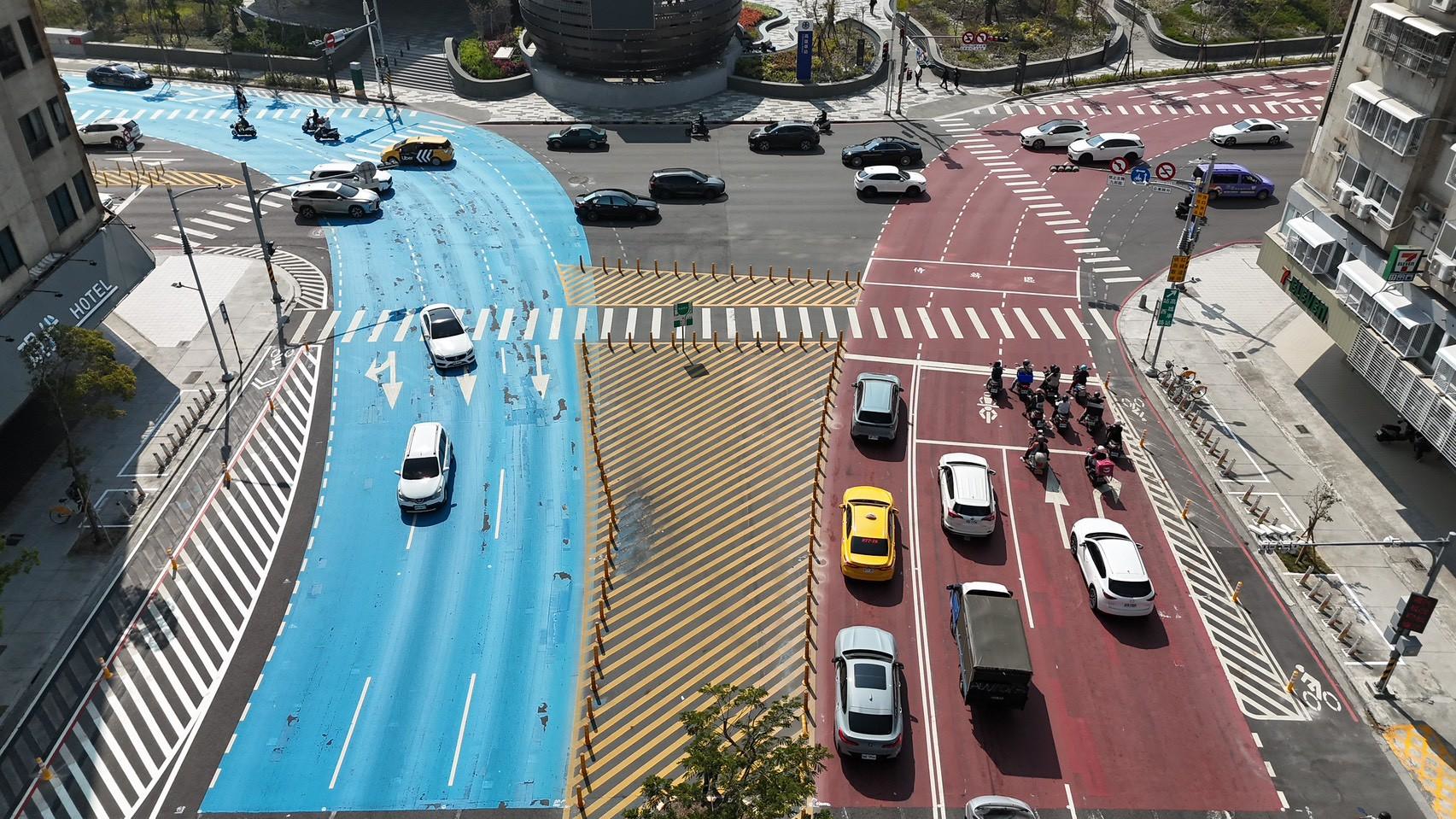 楊欽富表示,高雄車站為城市重要門戶,車流與人潮龐大,僅以義交人員指揮難以有效指引用路人通行,因此,自112年起於站東、站西路採用彩色標線鋪面,經由事故資料回溯與調查分析發現,三年下來彩色鋪面以其鮮明、更加直觀的特性,已潛移默化養成民眾站區用路習慣,也有效減少事故發生。