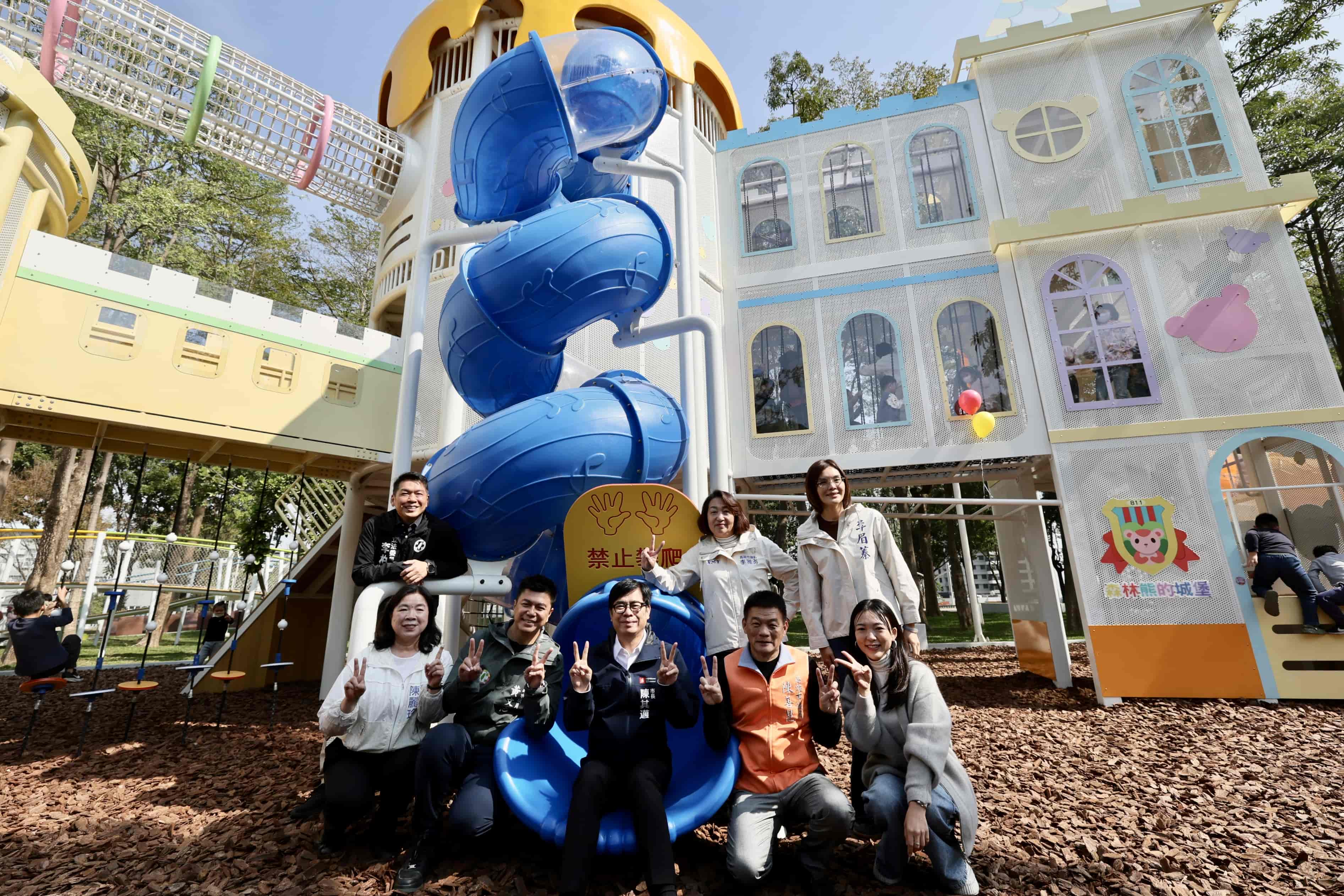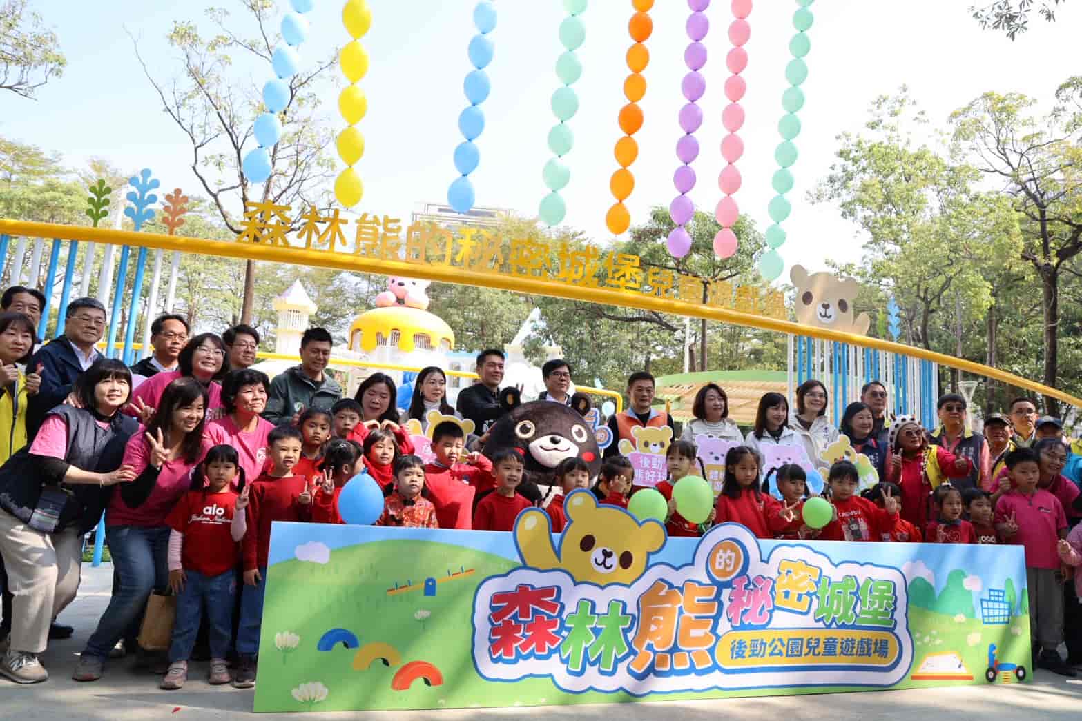 楠梓區後勁公園出現一隻巨大粉紅熊熊正張開雙臂,迎接孩子們的森林冒險之旅!高雄市長陳其邁今(9)日出席後勁公園兒童遊戲場「森林熊的秘密城堡」啟用時表示,楠梓因產業發展而快速成長,公共建設必須同步到位,本次改造不只是景觀的翻新,更是對地方歷史的尊重與對永續生態的承諾。後勁公園正從過去的工業記憶,轉型為守護健康的科技綠肺,亦象徵楠梓社區活力再升級。
