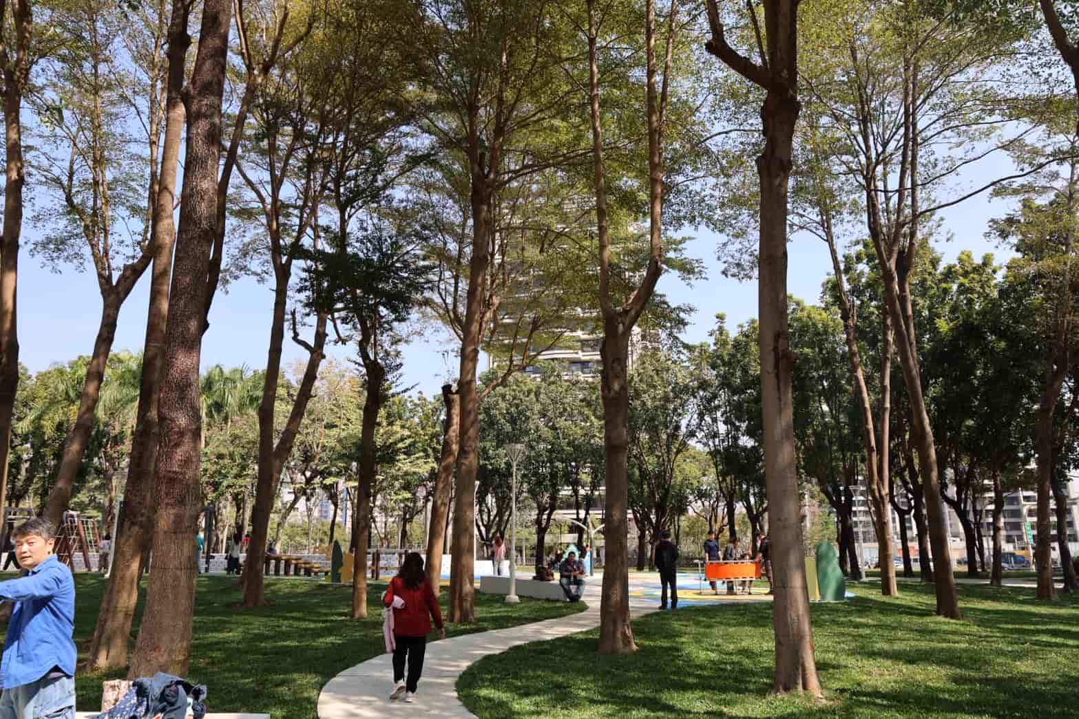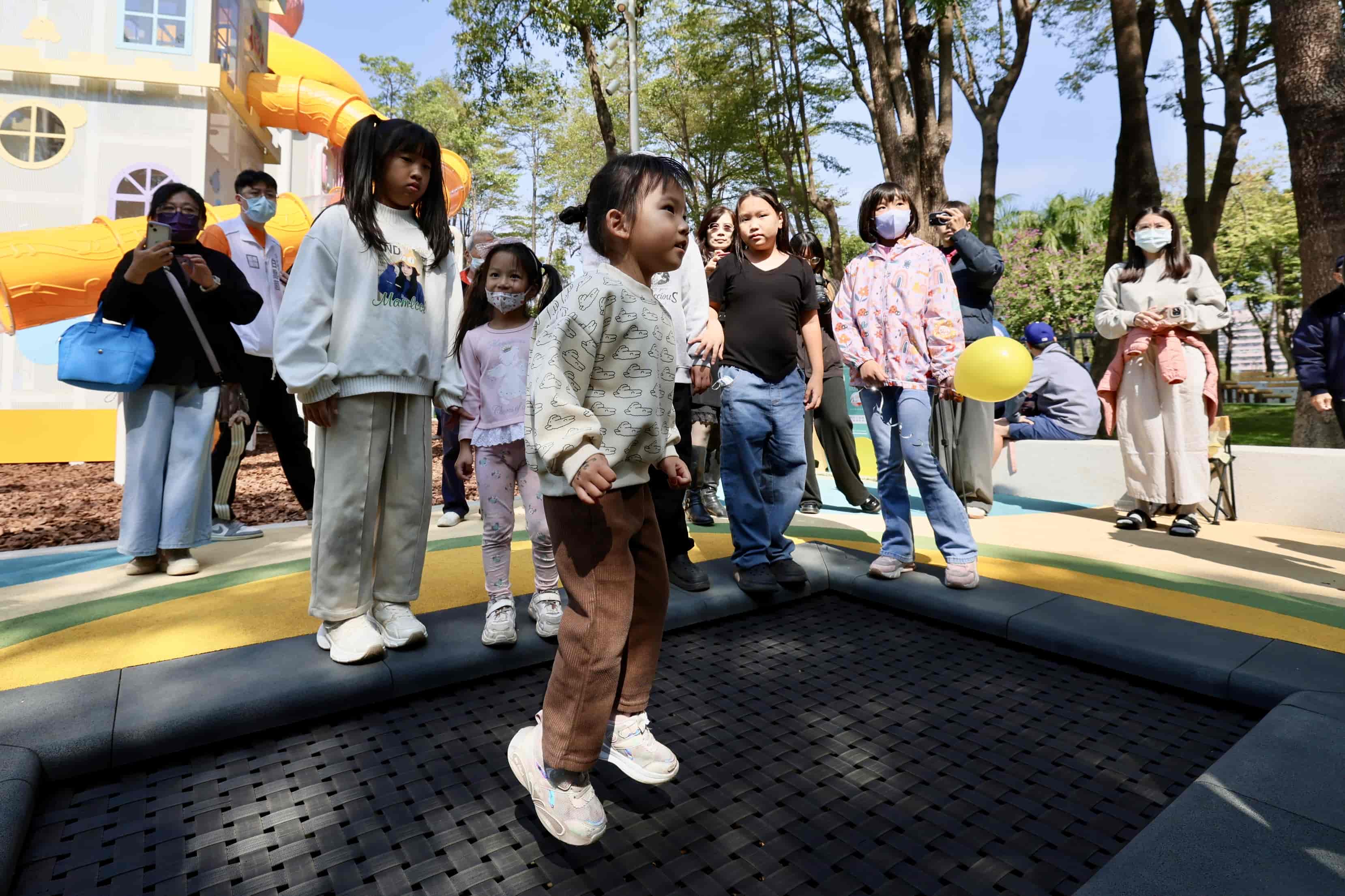 遊戲場設計強調與既有環境的融合,營造出在綠蔭中探索的趣味感。場內最具特色的「3D 立體城堡遊戲塔」,孩子們可以穿梭其中,最終抵達粉紅熊熊所在的頂端,享受登高望遠的成就感。全區規劃九大遊戲區、30 項設施,包括沙坑、鞦韆、彈跳床、冒險挑戰區及樂齡體健區,各區並以「飄浮步道」串聯,讓不同年齡層的市民都能安心遊玩。